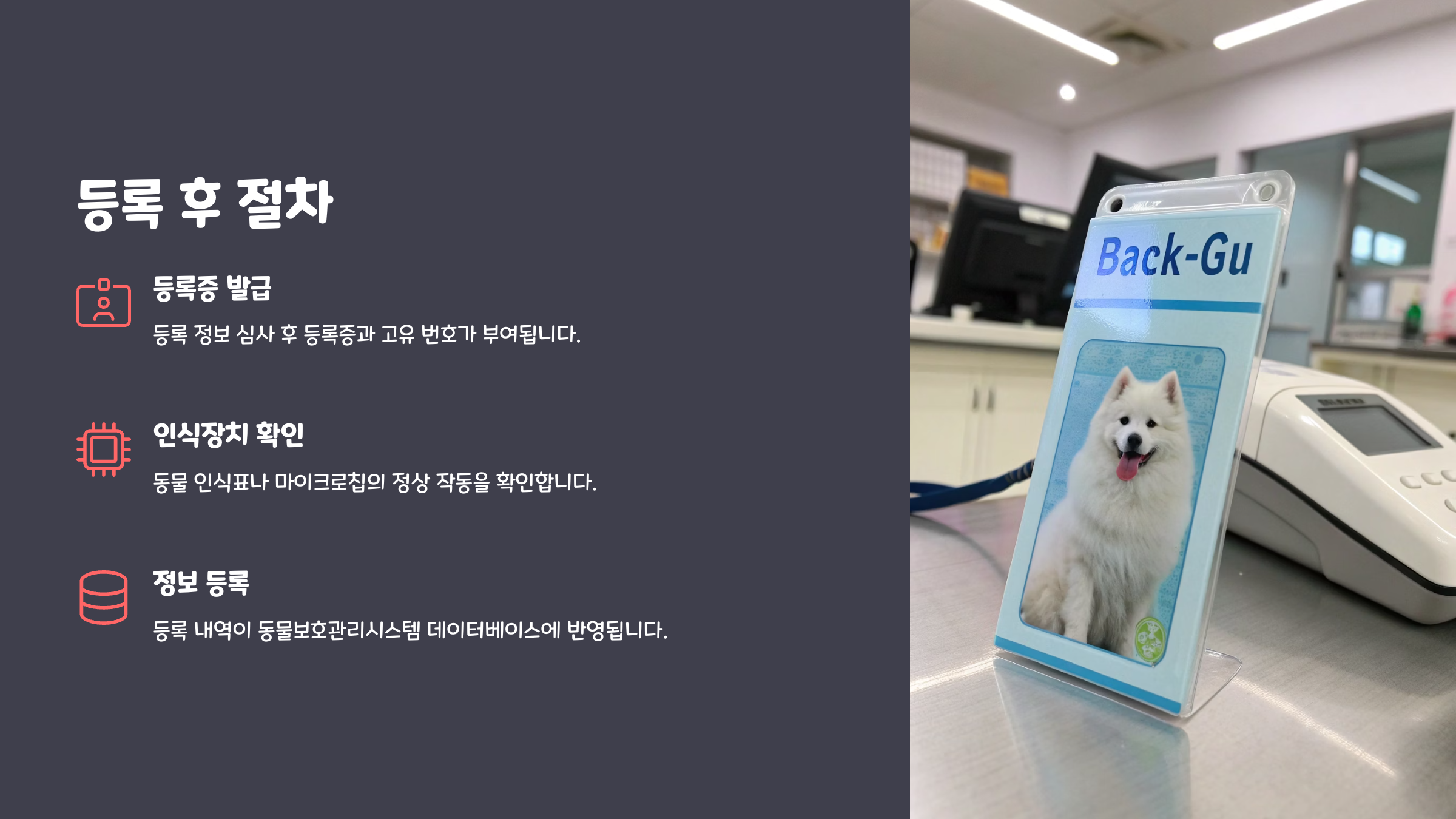 - 동물등록증 수령: 신청 및 시술 완료 후 동물등록증을 발급받습니다. (보통 며칠 소요 후 우편 발송 또는 직접 수령)