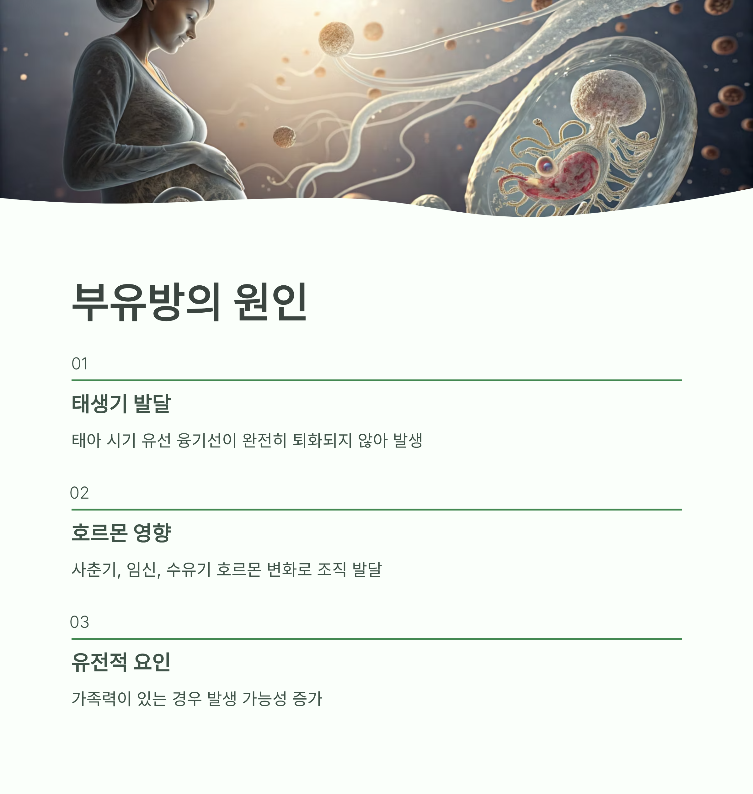 사람은 태아 시절에 유선선이라는 선을 따라 유방조직이 발달하게 되는데요, 이 선이 가슴까지 내려오다가 나머지는 자연스럽게 퇴화돼야 정상이에요. 그런데 퇴화되지 않고 남아있는 조직이 바로 부유방이 되는 거예요. 이건 선천적인 구조라서 후천적인 예방법은 없지만, 성인이 되기 전까지는 눈에 띄지 않다가 임신, 생리, 체중 증가 등으로 인해 커질 수 있어요.