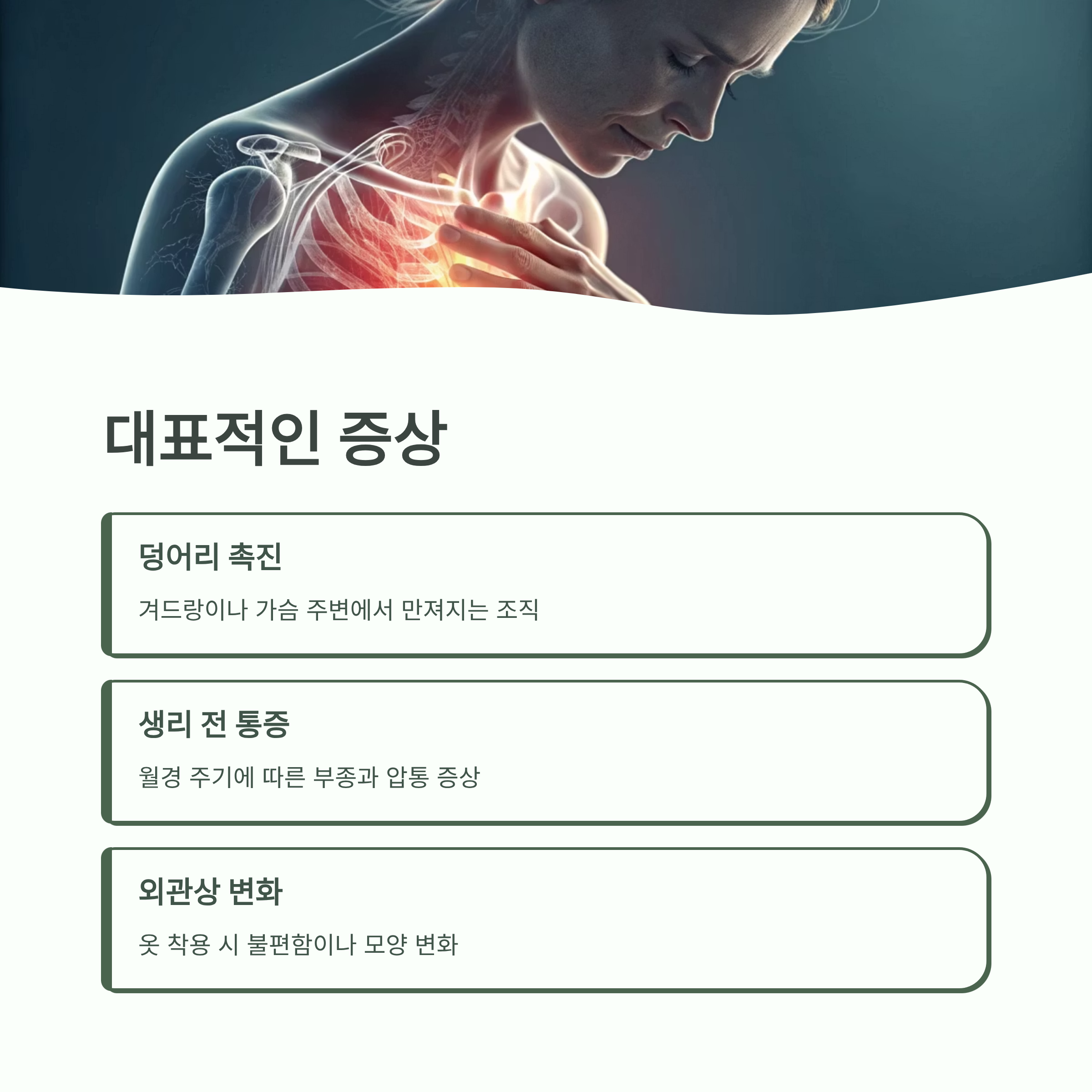 부유방의 대표적인 증상은 겨드랑이나 몸의 다른 부위에 존재하는 ‘멍울’ 또는 ‘혹’이에요. 이 멍울은 단순한 지방과는 달리, 만졌을 때 딱딱하거나 유방처럼 유선 구조를 느낄 수 있는 게 특징이에요. 특히 생리 전후나 임신, 수유기, 폐경기 같은 호르몬 변화 시기에 크기가 커지거나 통증이 생기기도 해요.