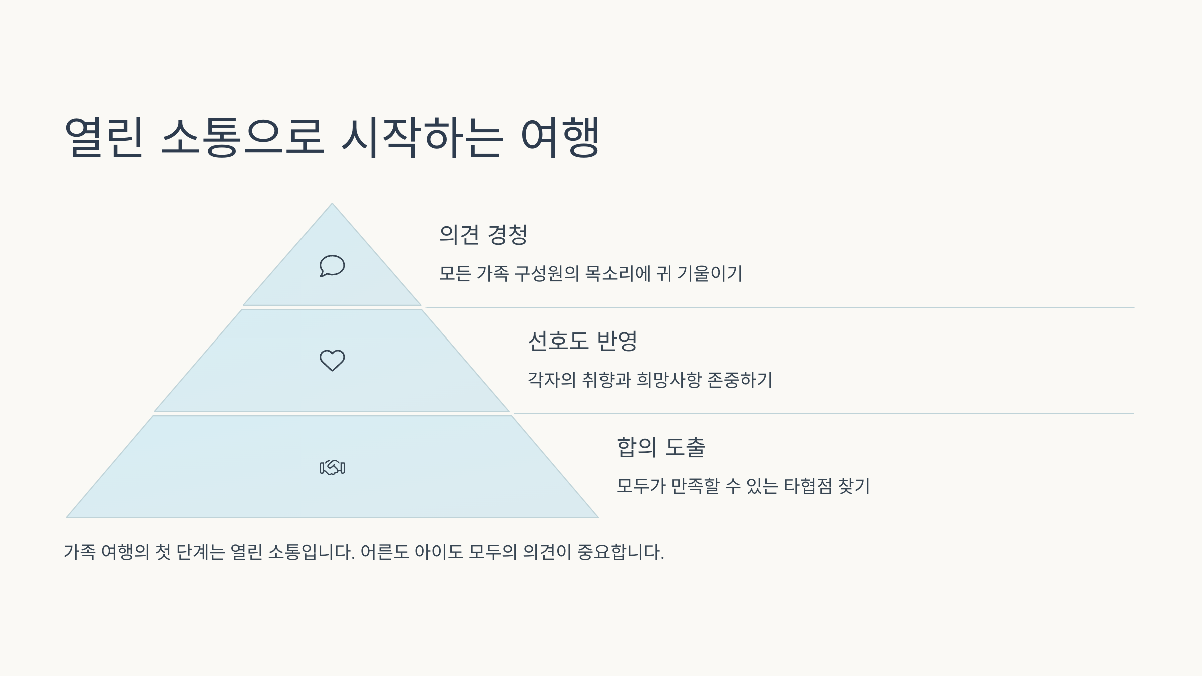 가족 여행 계획의 첫걸음은 가족 구성원 모두의 의견을 듣는 것에서 시작합니다. 아이들이 가고 싶은 곳, 부모님이 원하시는 활동, 각자가 중요하게 생각하는 여행의 요소(휴식, 관광, 체험 등)를 충분히 이야기 나누세요. 모든 의견을 다 수용할 수는 없겠지만, 서로의 기대를 이해하고 최대한 반영하려는 노력은 여행 전부터 가족 간의 유대감을 높여줍니다.