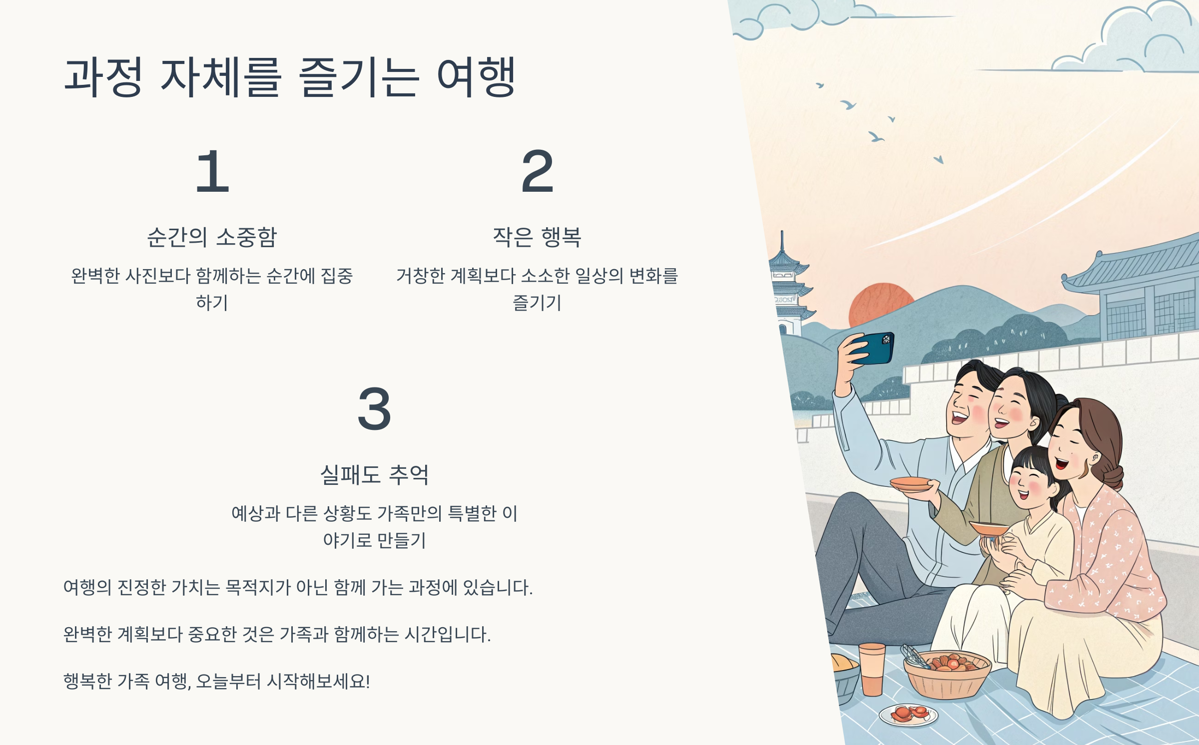 가장 중요한 것은 서로를 이해하고 배려하는 마음, 그리고 함께하는 모든 순간을 소중히 여기는 자세입니다. 이번 가족 여행이 여러분 모두에게 잊지 못할 아름다운 추억으로 가득 채워지기를 진심으로 응원합니다! 😊