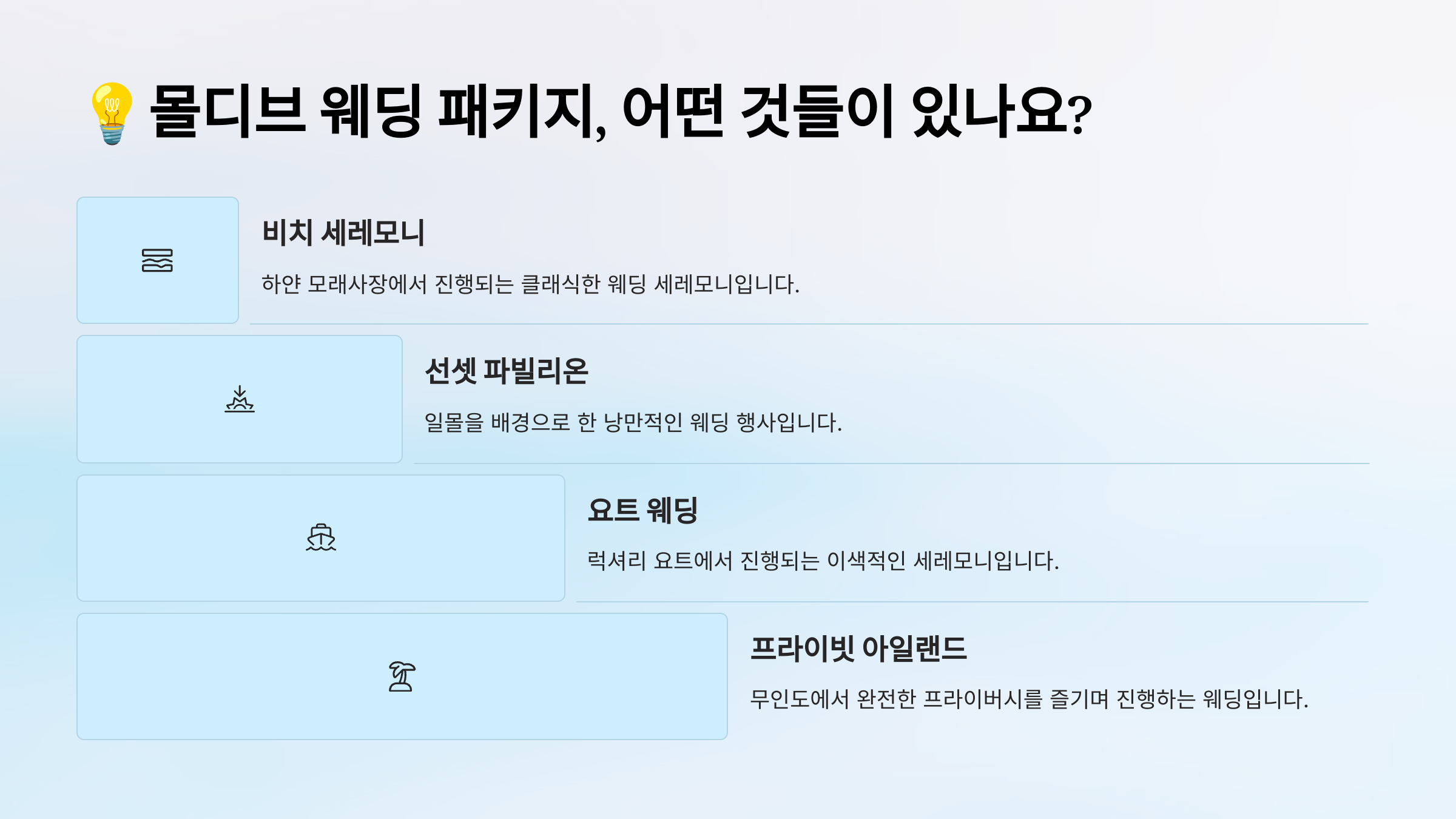 - 💡 몰디브 웨딩 패키지, 어떤 것들이 있나요?
