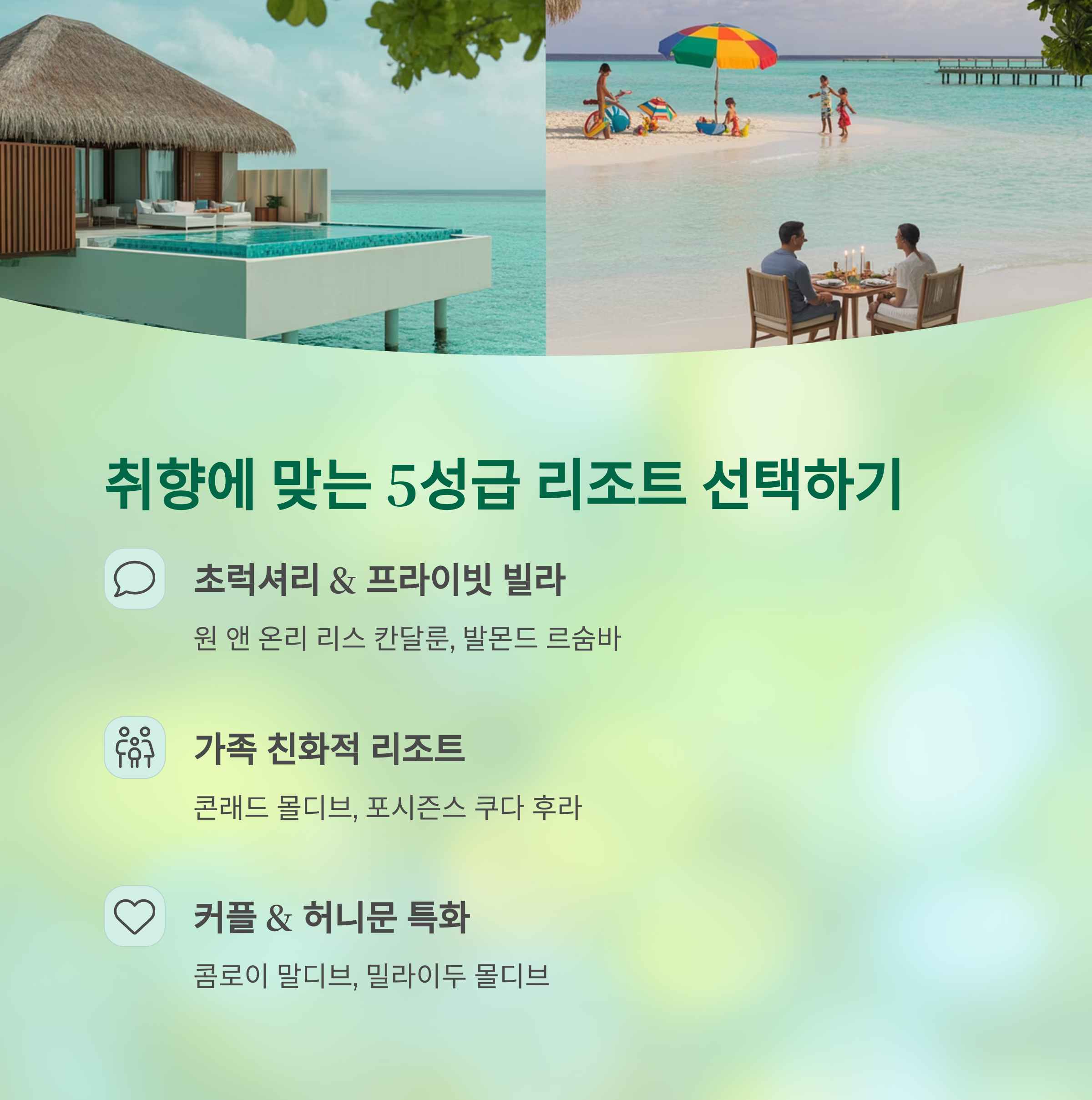 - 예시 리조트군: W Maldives, Baros Maldives, Hurawalhi Island Resort (일부 성인 전용) 등.