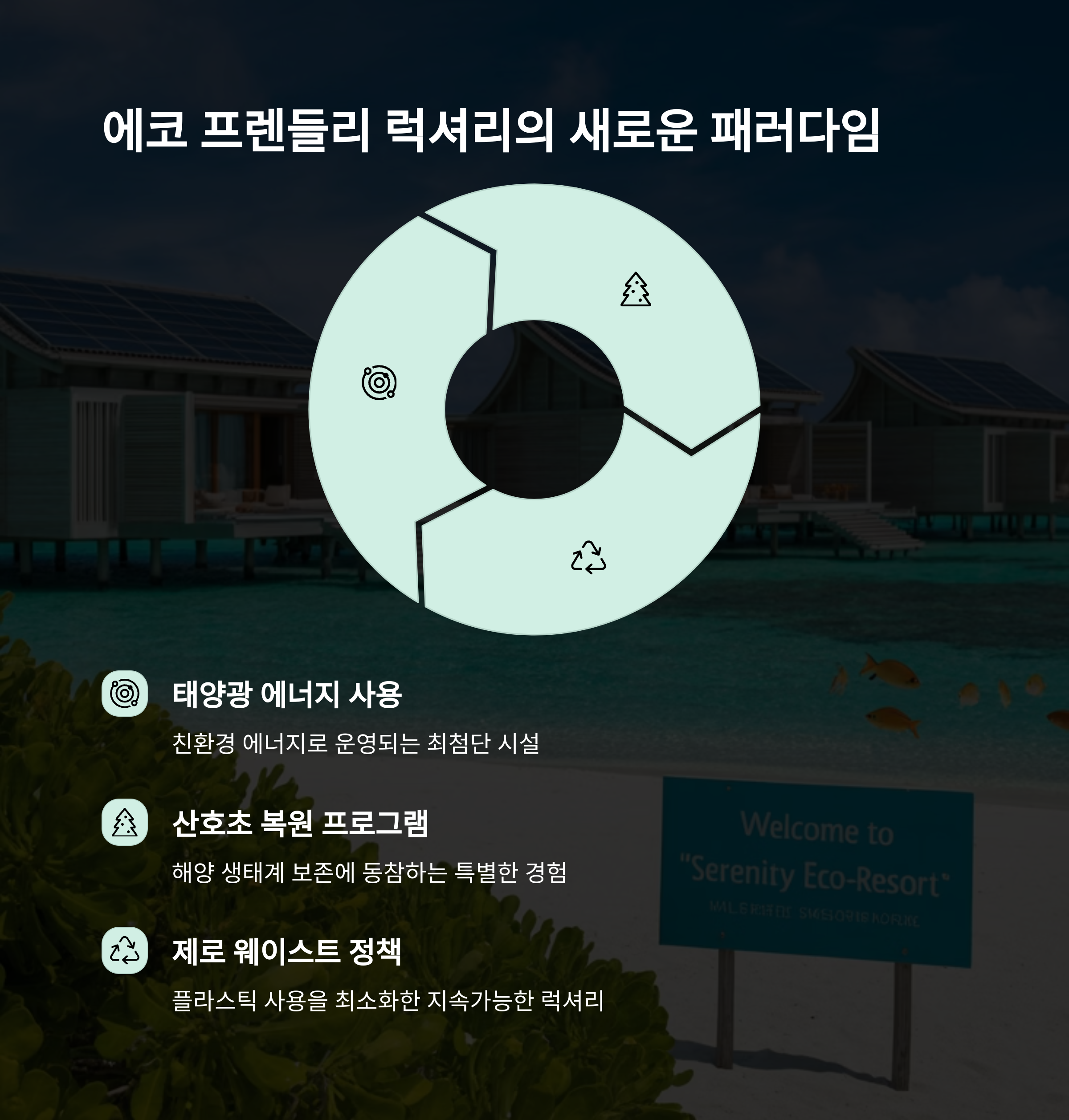 - 특징: 지속 가능한 운영, 친환경 프로그램, 자연주의 컨셉, 해양 생물 보호 활동.