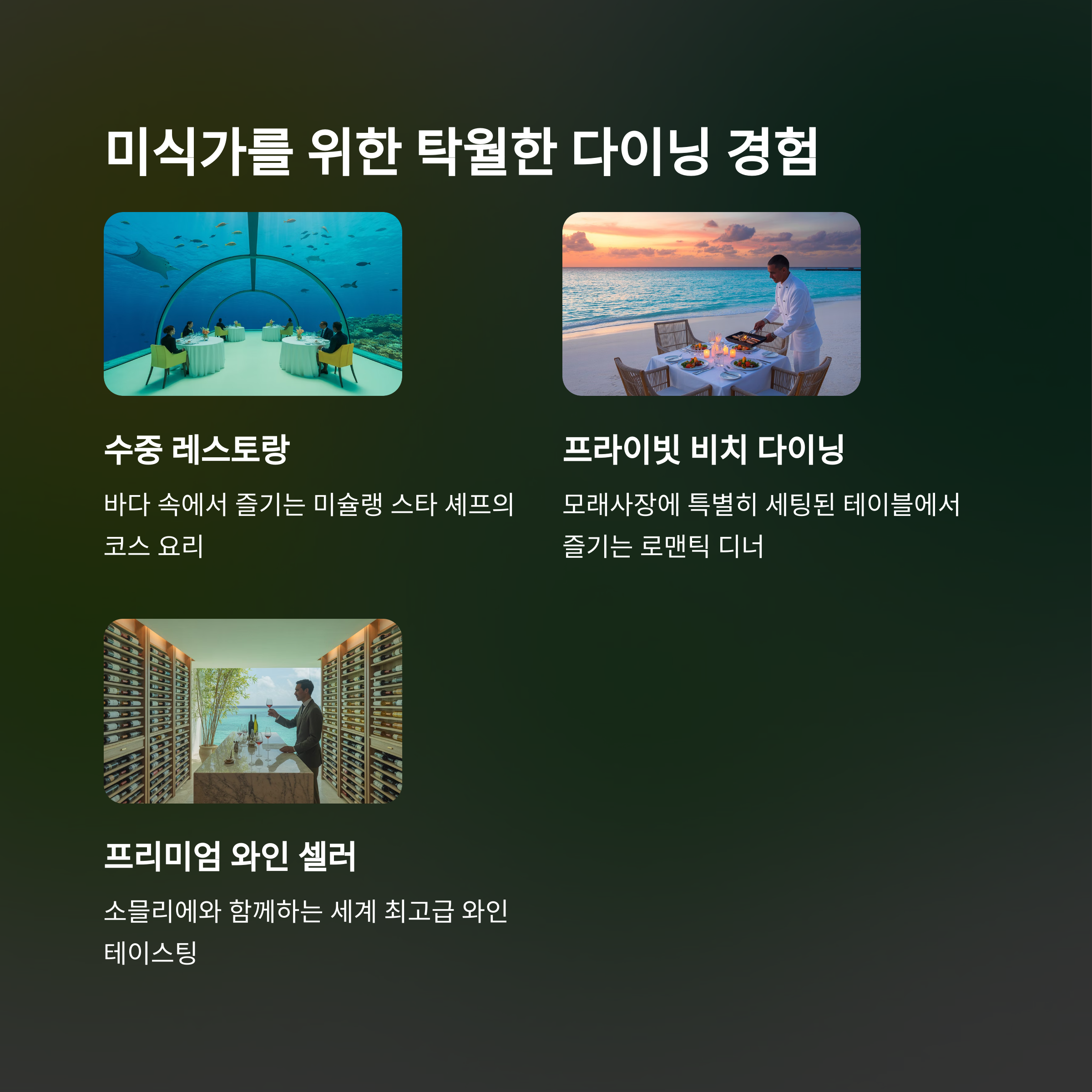 - 예시 리조트군: Conrad Maldives Rangali Island (수중 레스토랑 Ithaa), Anantara Kihavah Maldives Villas (수중 레스토랑 SEA), The St. Regis Maldives Vommuli Resort 등.