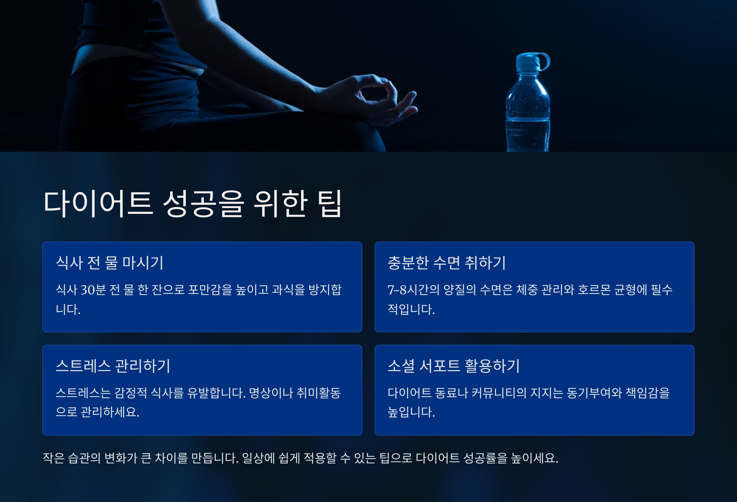 - 🌱 생활 습관의 변화: 다이어트는 '특정 기간 동안만 하는 것'이 아니라, 건강한 식습관과 규칙적인 운동을 일상의 일부로 만드는 것입니다. 다이어트가 끝난 후에도 유지할 수 있는 현실적이고 즐거운 습관을 찾아야 합니다.