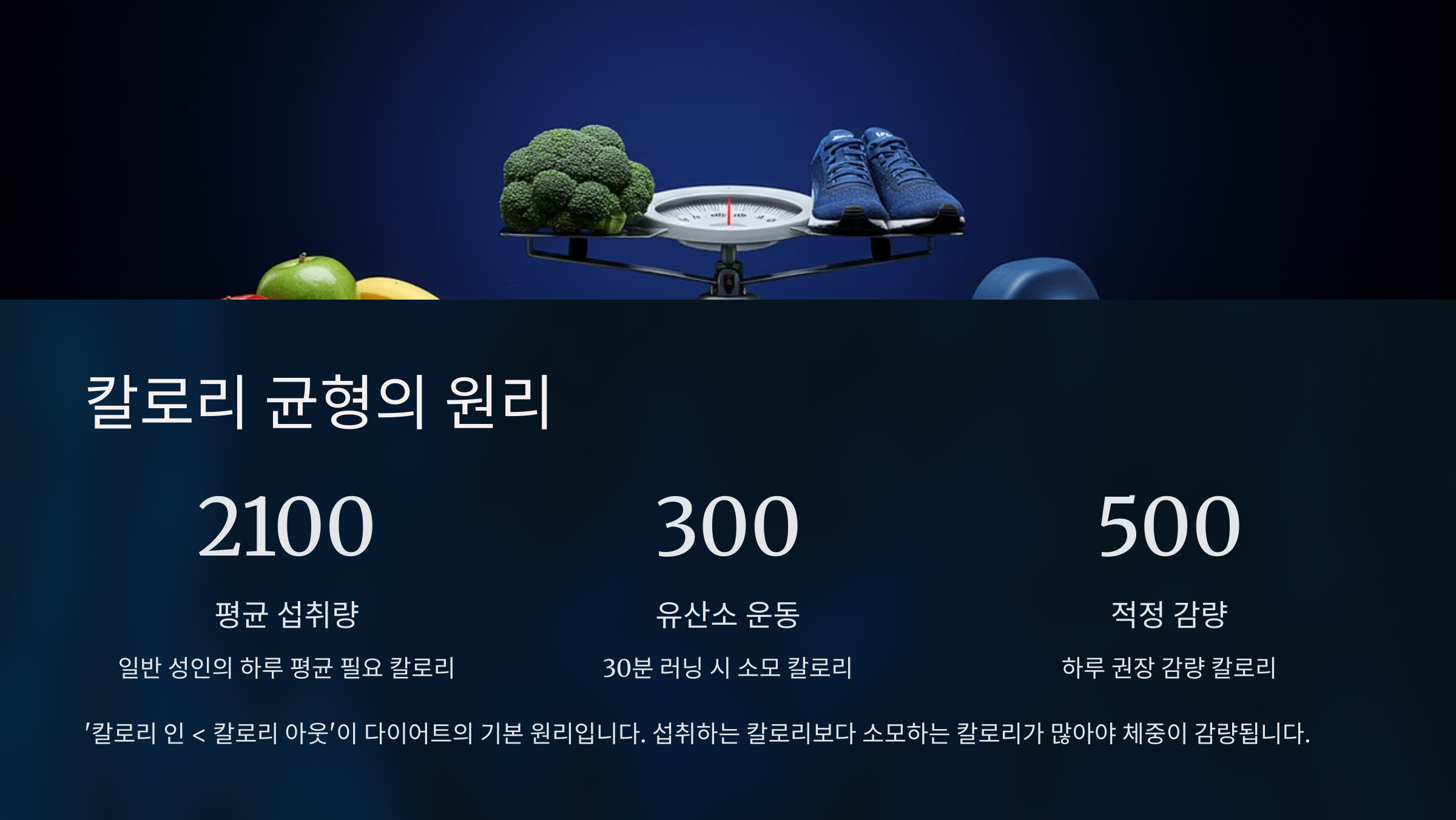 | 체중 감량 조건 | 섭취 칼로리 < 소비 칼로리 (칼로리 부족) |
