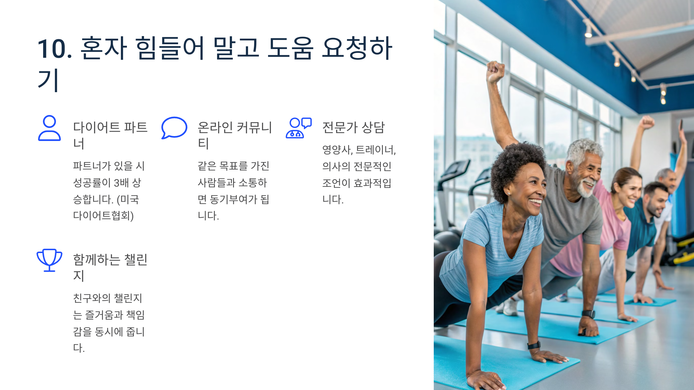다이어트는 때로는 외롭고 힘든 싸움처럼 느껴질 수 있습니다. 하지만 혼자 모든 것을 짊어지려 하지 마세요. 주변의 지지나 전문가의 도움을 받는 것은 나약함이 아니라, 목표를 향해 나아가는 현명한 방법입니다.
