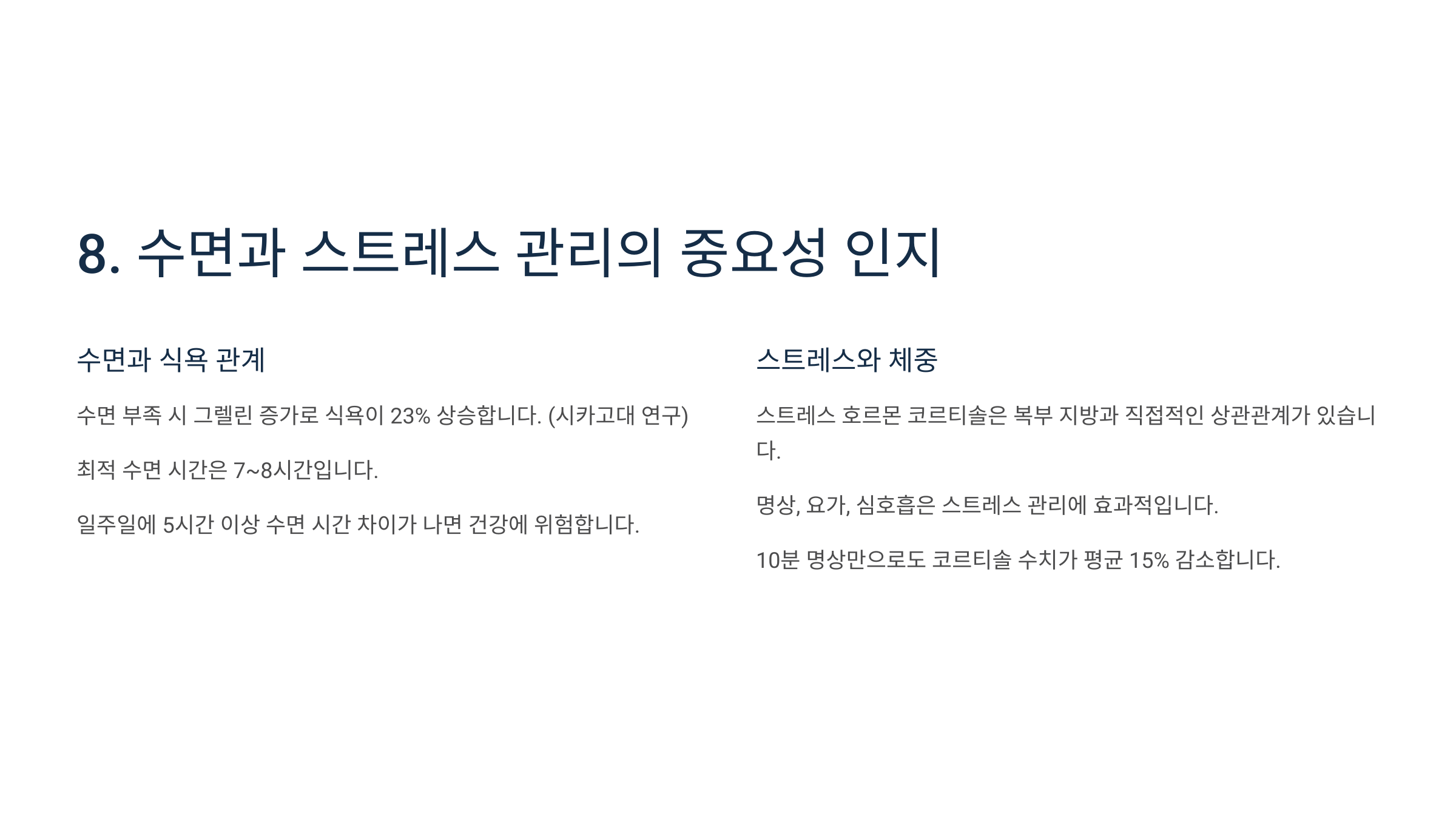 다이어트는 단순히 먹는 것과 움직이는 것만 조절하는 것이 아닙니다. 충분한 수면과 효과적인 스트레스 관리 역시 성공적인 다이어트를 위해 반드시 신경 써야 할 중요한 요소입니다.