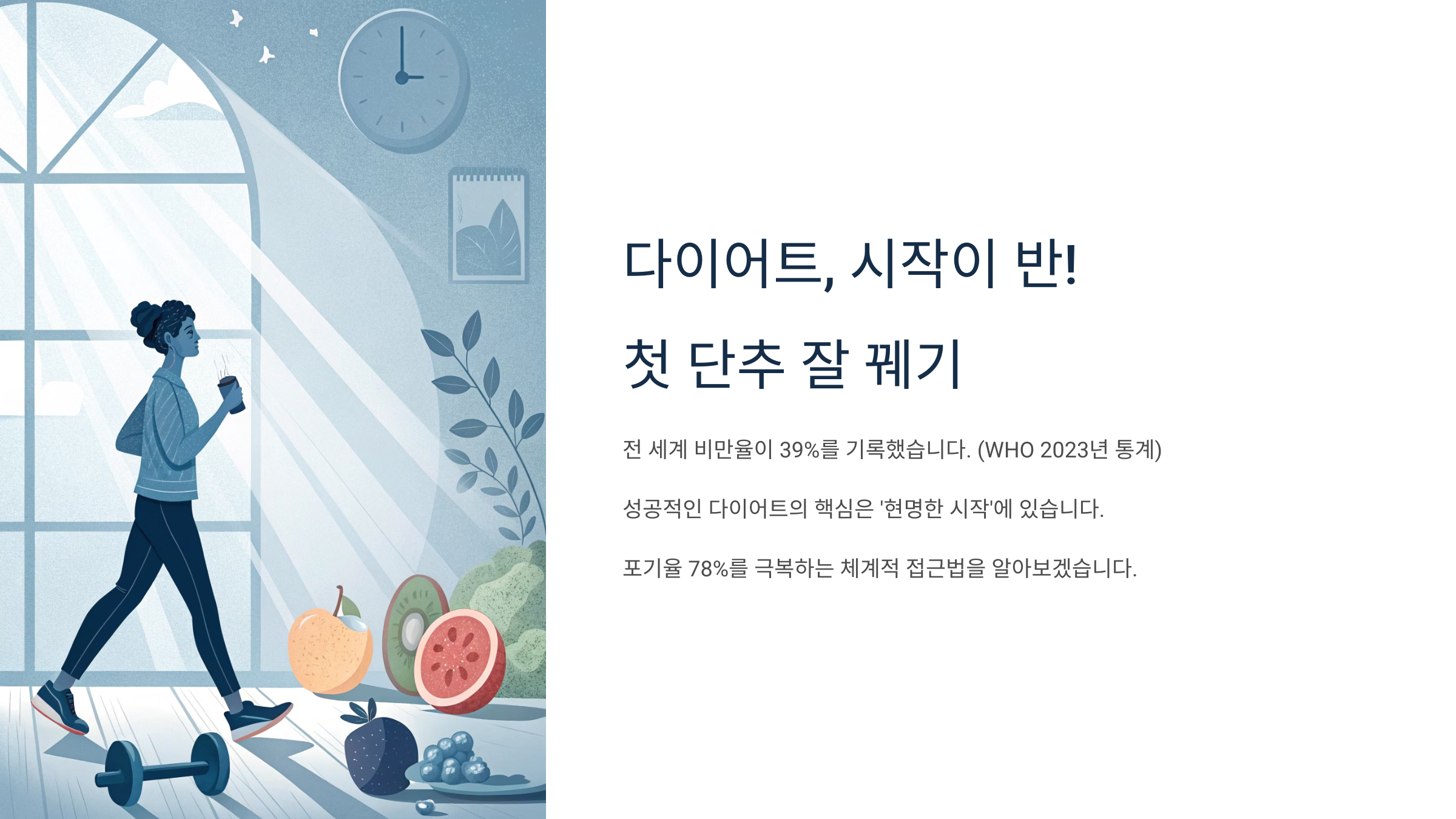 성공적인 다이어트는 단거리 경주가 아니라 마라톤과 같습니다. 시작 단계에서부터 올바른 방향을 설정하고 지속 가능한 습관을 만드는 것이 무엇보다 중요합니다. 거창한 계획보다는 작은 실천 가능한 단계부터 차근차근 밟아나가는 것이 성공의 열쇠입니다.