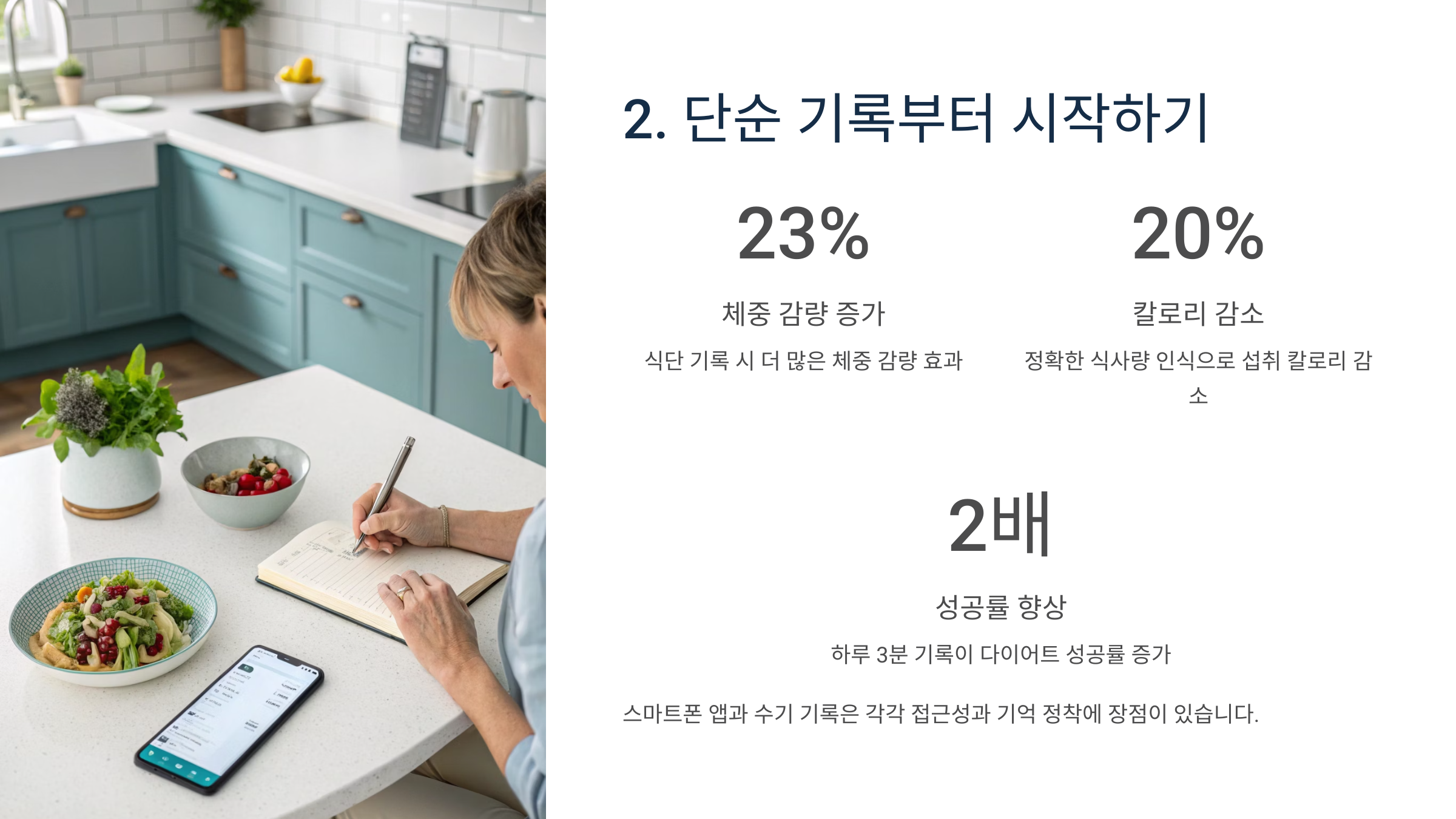 부담 갖지 말고 최소 1주일 정도만 꾸준히 기록해보세요. 자신의 식습관과 생활 패턴을 객관적으로 파악하는 것은 성공적인 다이어트 계획 수립의 가장 중요한 첫걸음입니다.