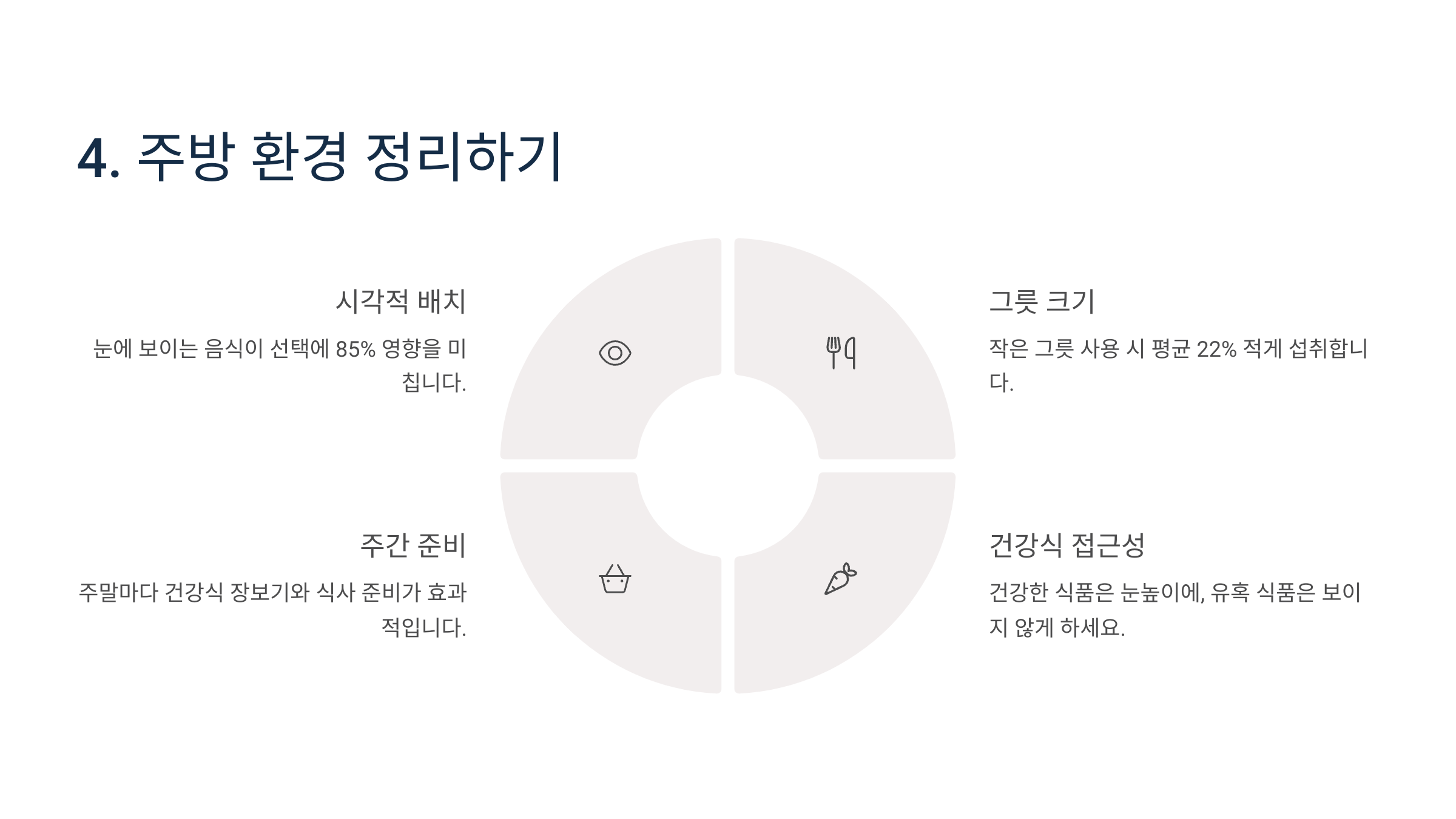 "눈에서 멀어지면 마음에서도 멀어진다"는 말이 있죠. 다이어트를 방해하는 음식들이 눈에 잘 띄는 곳에 있다면 유혹을 뿌리치기 어렵습니다. 건강한 식단을 유지하기 위해서는 주방 환경을 먼저 정비하는 것이 중요합니다.