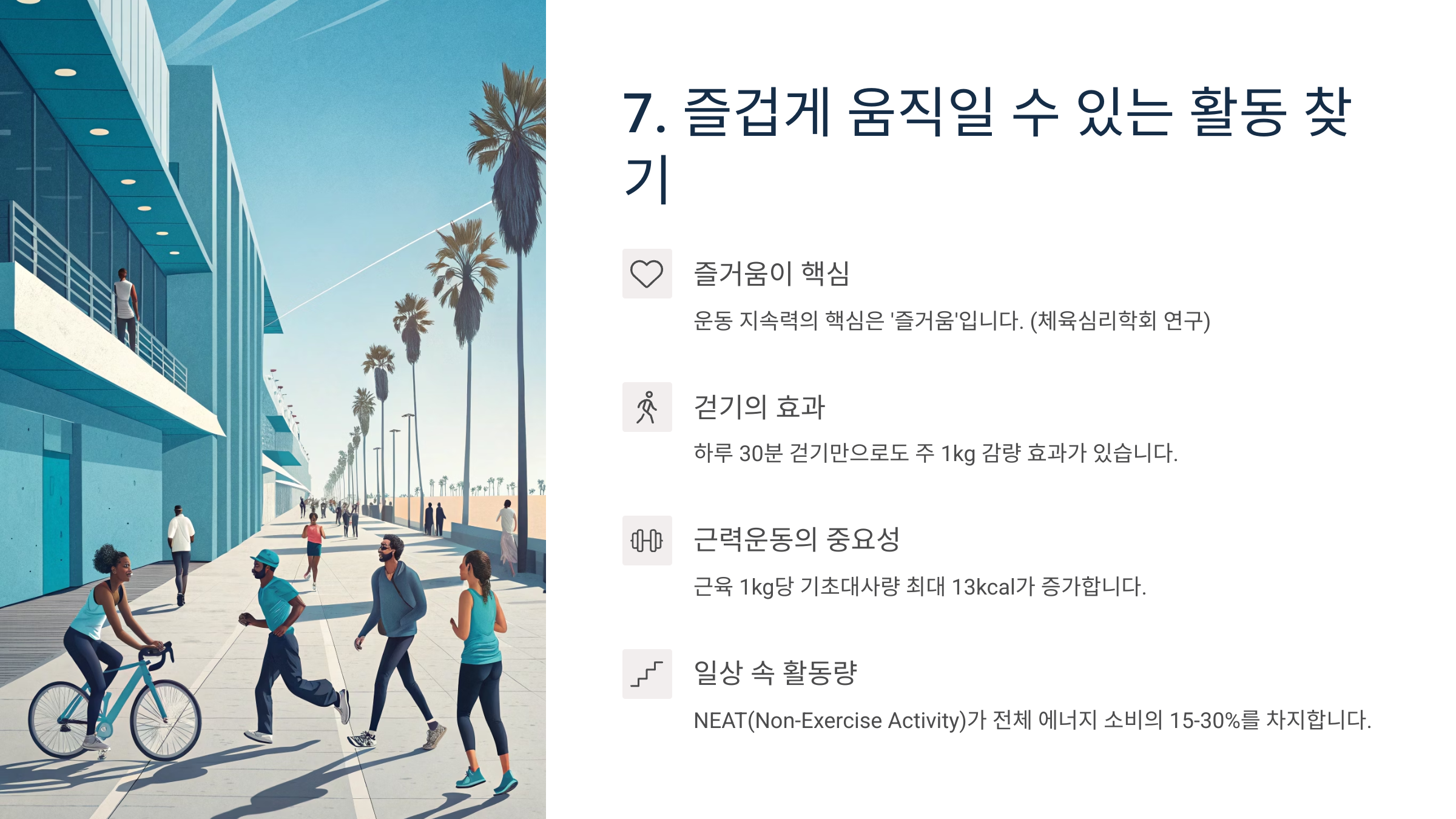 - 🚶♀️ 일상 속 활동량 늘리기: 꼭 '운동 시간'을 따로 내기 어렵다면, 대중교통 이용 시 한 정거장 먼저 내려 걷기, 점심시간에 짧게 산책하기, 서서 일하는 시간 늘리기 등 생활 속에서 신체 활동량을 늘리는 습관을 만드세요.