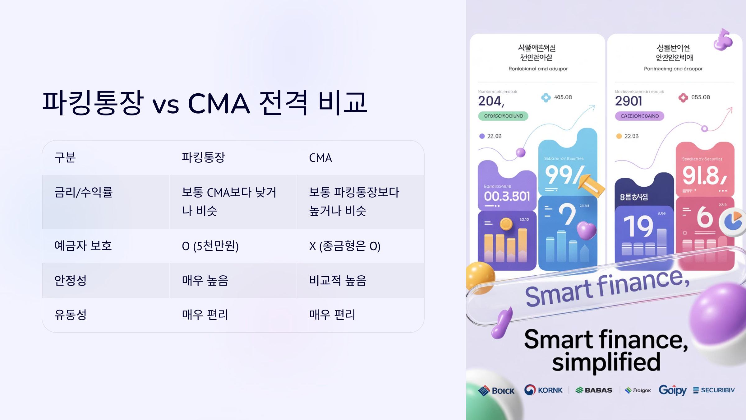 | 구분 | 파킹통장 (은행/저축은행) | CMA (증권사/종금사) |