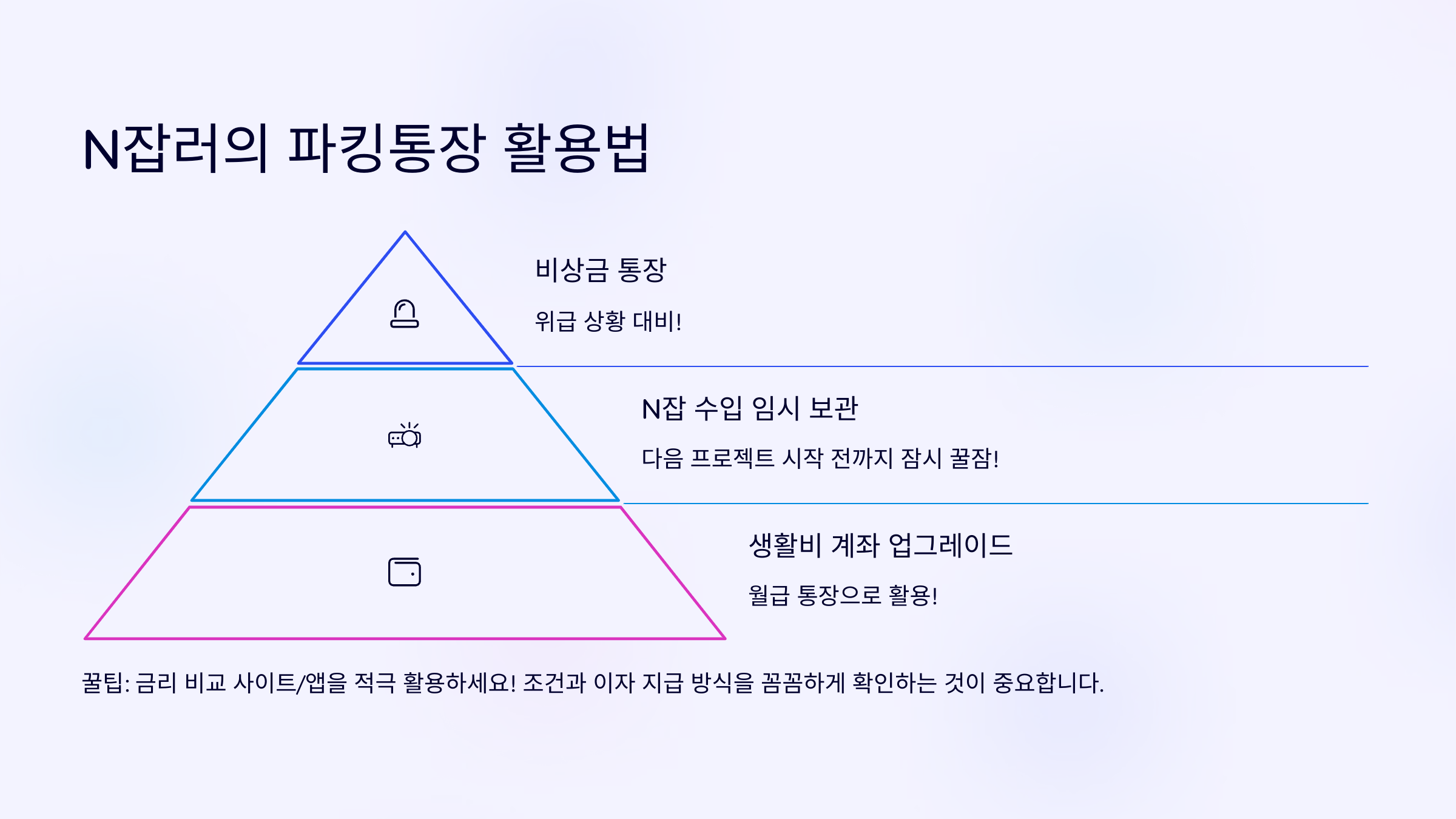 “N잡으로 열심히 번 돈, 묵혀두지 마세요! 파킹통장 & CMA 똑똑하게 활용해서 이자 팍팍! 불려봐요🔥”