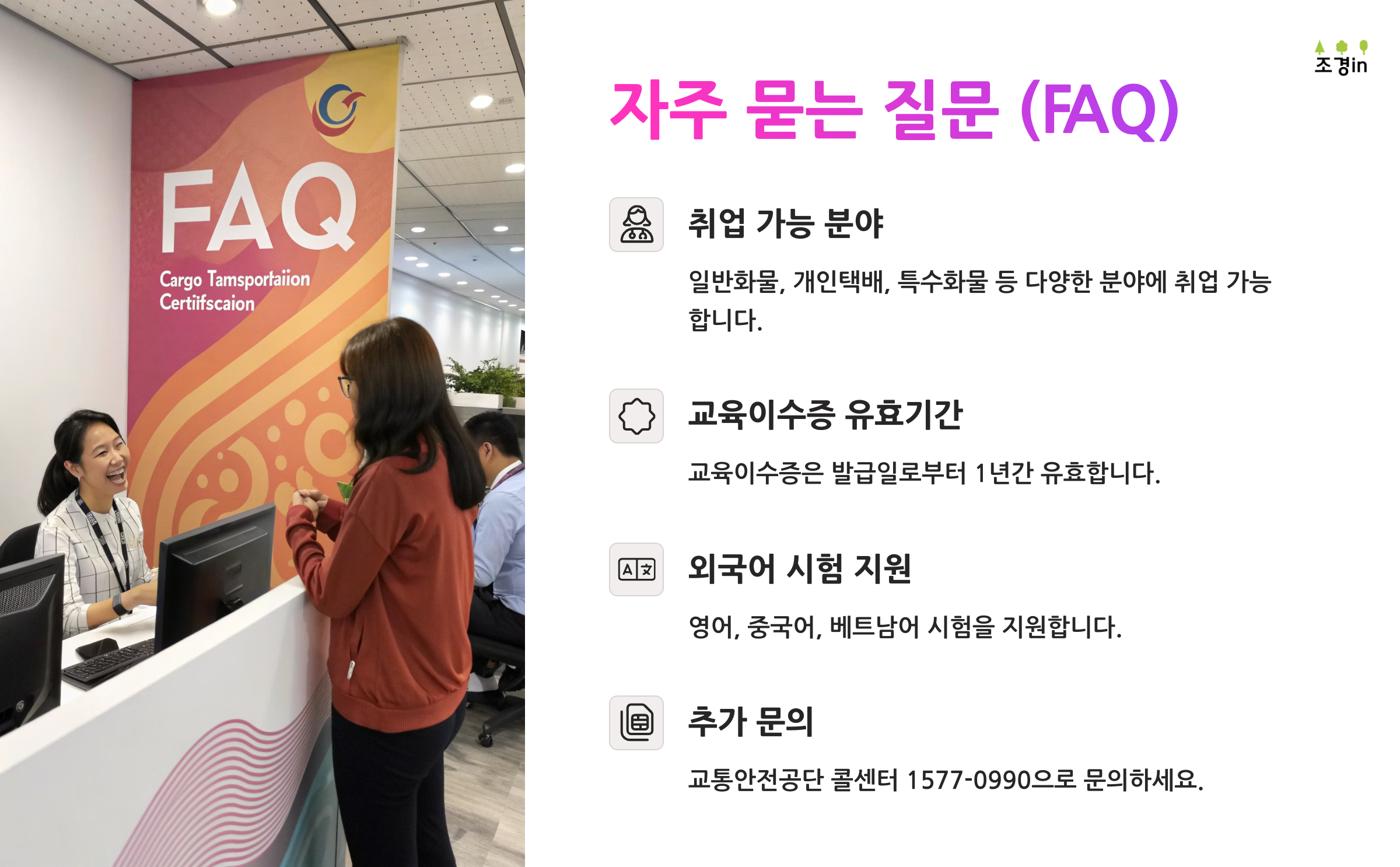 - 화물 취급 요령 (15문항): 화물의 종류 및 특성, 상하차 작업 요령, 적재 및 결박 방법, 위험물 취급 등