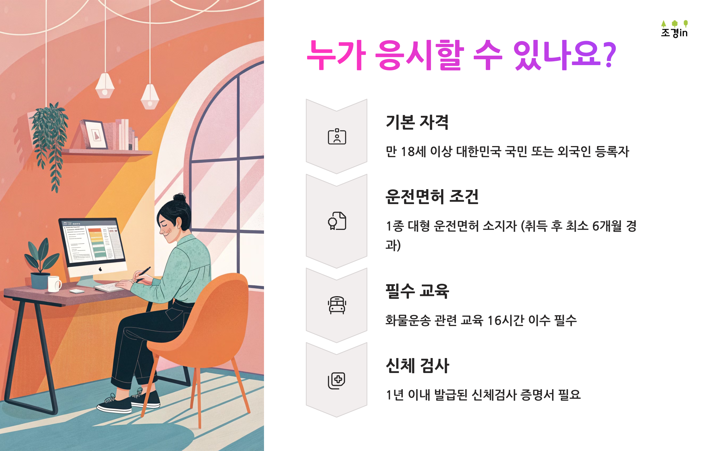 화물운송 종사자격시험에 응시하려면 다음의 자격 요건을 모두 충족해야 합니다. 하나라도 부족하면 시험에 응시할 수 없으니 꼼꼼히 확인하세요.