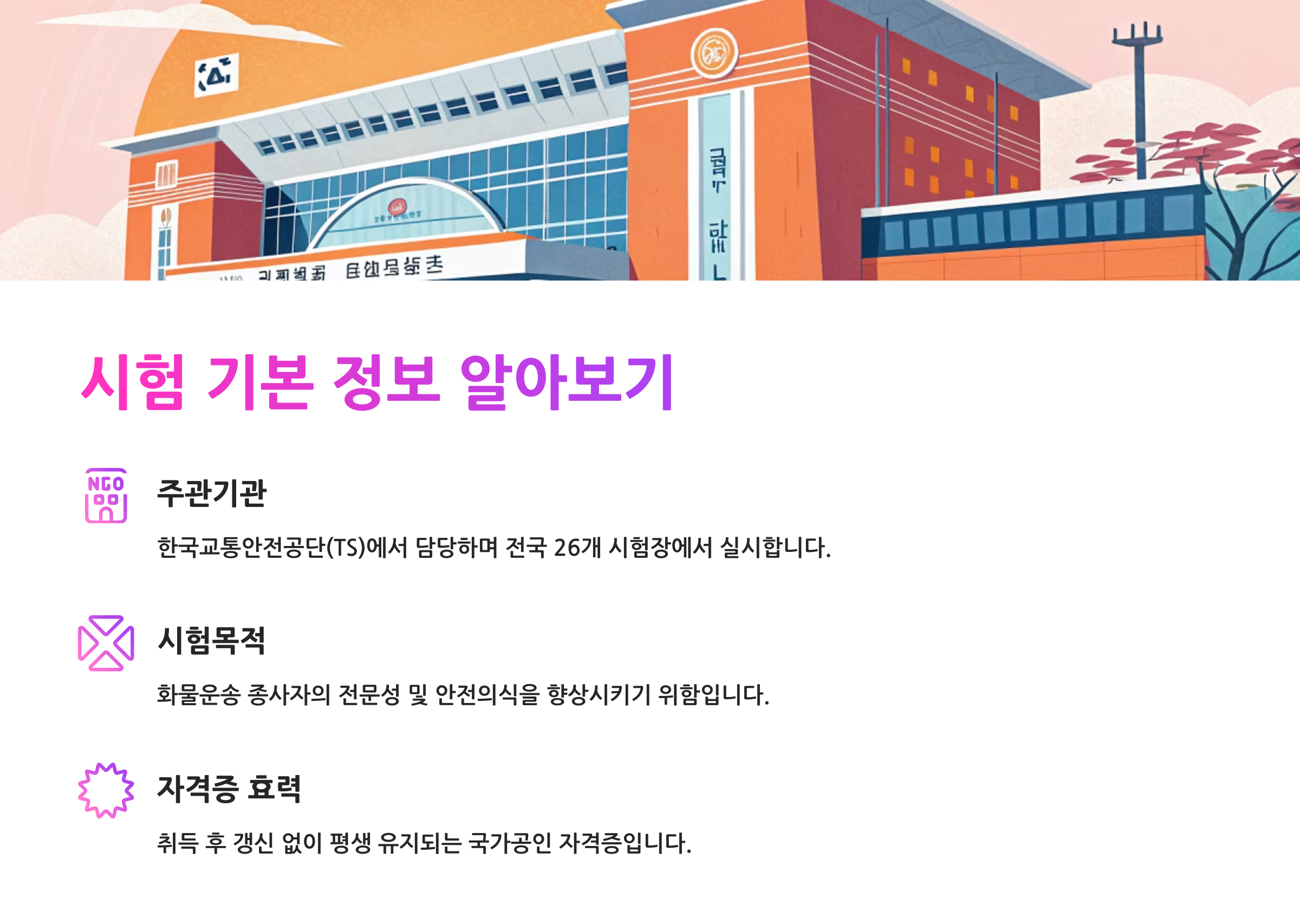 즉, 이 시험은 단순한 운전면허와는 별개로, '직업'으로서 화물 운송을 하기 위한 전문 자격임을 알 수 있습니다. 시험 주관처가 TS한국교통안전공단이라는 점을 기억해두시면 일정 확인 및 접수에 도움이 됩니다.