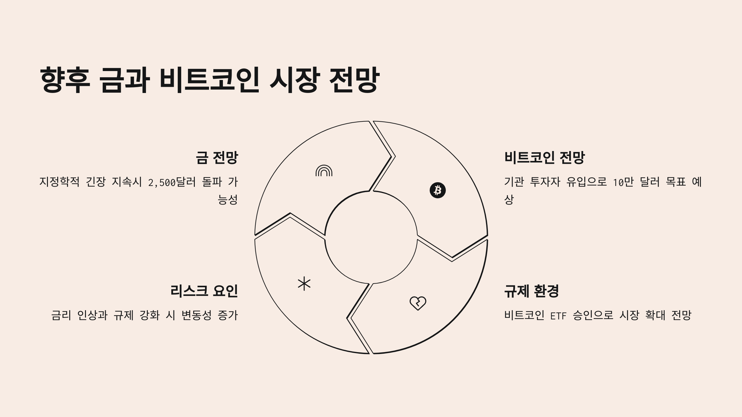 - 비트코인: 높은 변동성은 여전한 위험 요인이지만, 기술적 발전과 제도권 편입 가속화, 그리고 새로운 투자자 유입 등으로 장기적인 성장 가능성에 대한 기대감도 공존합니다. 규제 환경 변화가 주요 변수가 될 수 있습니다.