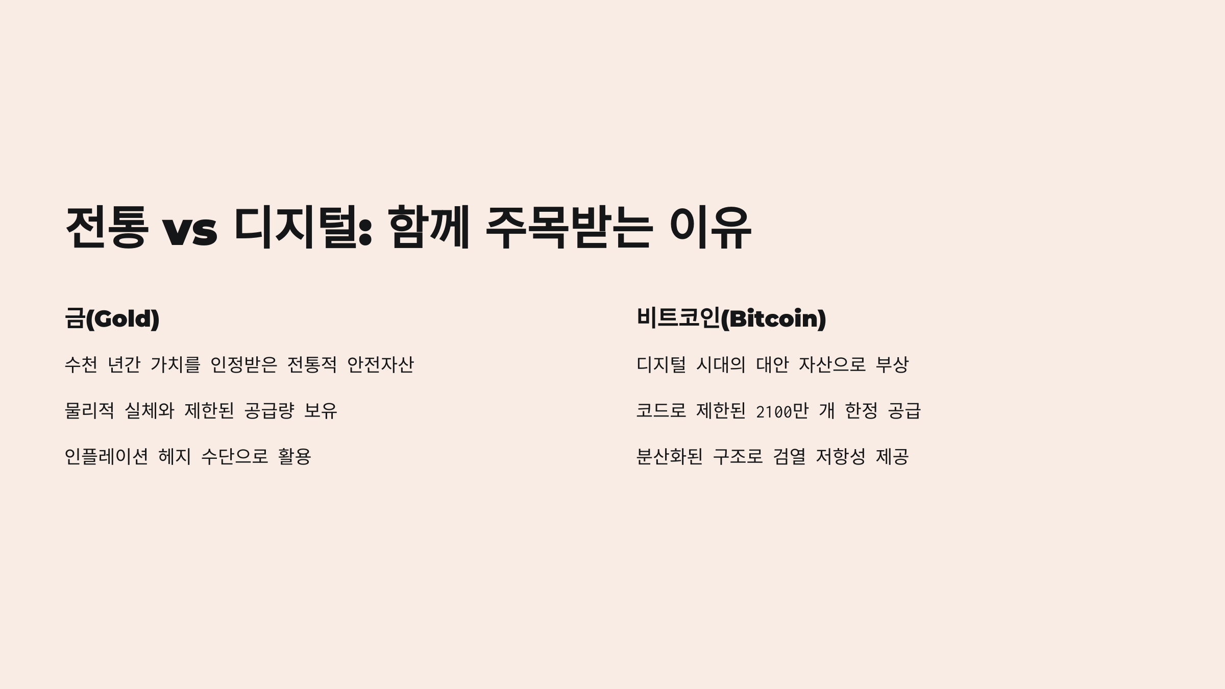 - 가치 저장 수단으로서의 인식: 금은 수천 년 동안 가치를 저장하는 수단으로 인정받아 왔으며, 비트코인은 공급량이 제한되어 있고 탈중앙화된 특성으로 인해 인플레이션 헤지 수단 및 디지털 시대의 새로운 가치 저장 수단으로 여겨지고 있습니다.