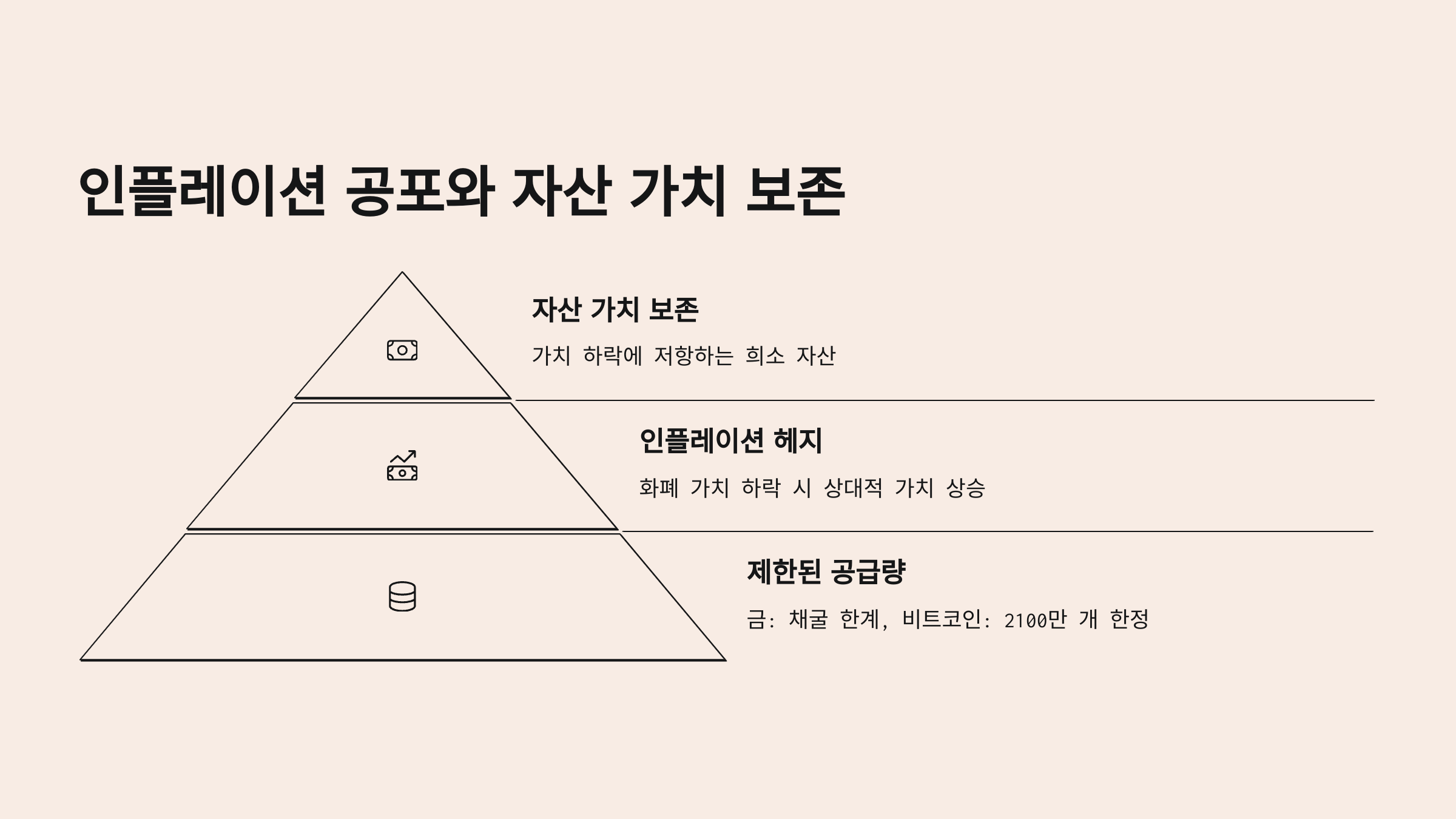 - 비트코인: 총 발행량이 2,100만 개로 제한되어 있어, 무한정 발행될 수 있는 법정화폐와 달리 인플레이션으로부터 자유롭다는 주장이 제기됩니다. 이러한 희소성이 가치 저장 수단으로서의 매력을 높이고 있습니다.