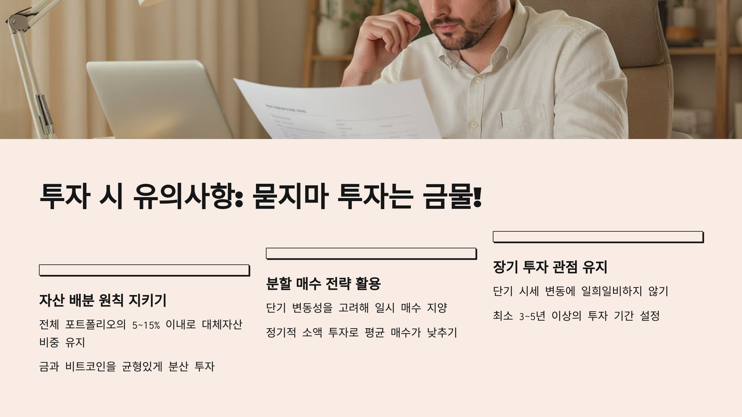 - 충분한 정보 습득: 각 자산의 특성, 시장 상황, 잠재적 위험 요인 등에 대해 충분히 공부하고 이해한 후 투자해야 합니다.