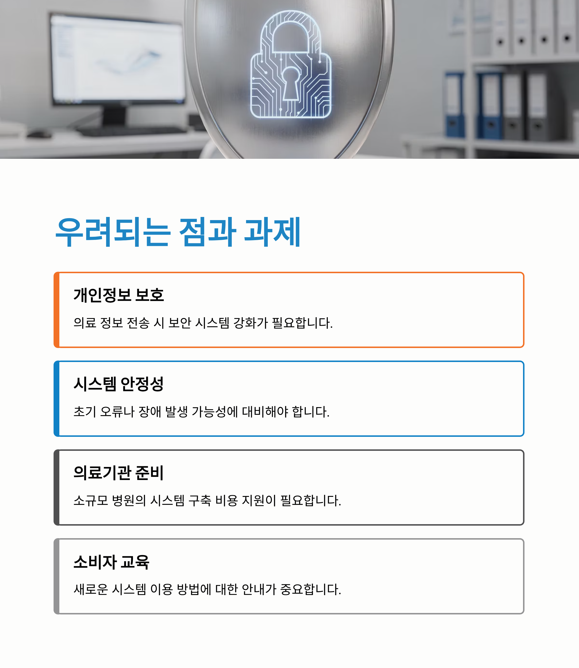 - 대책: 정부 및 관련 기관에서 중소 병·의원의 시스템 구축을 위한 기술적·재정적 지원 방안을 마련하고 있습니다.