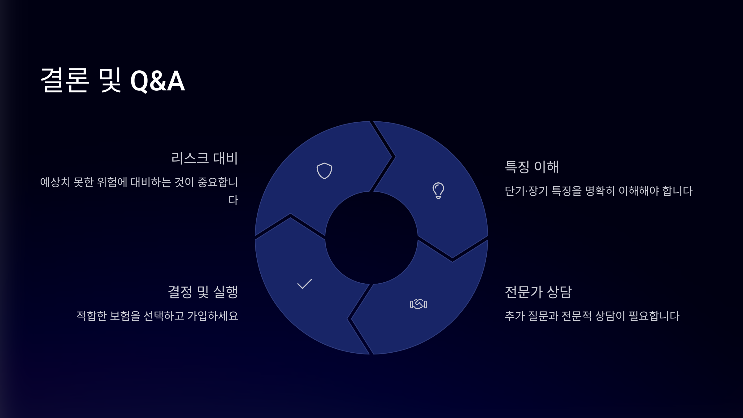 - (장기적 비용 예측/안정성 중요) → 장기보험 고려: 보험료 할인 혜택과 안정적인 비용 관리가 가능합니다.