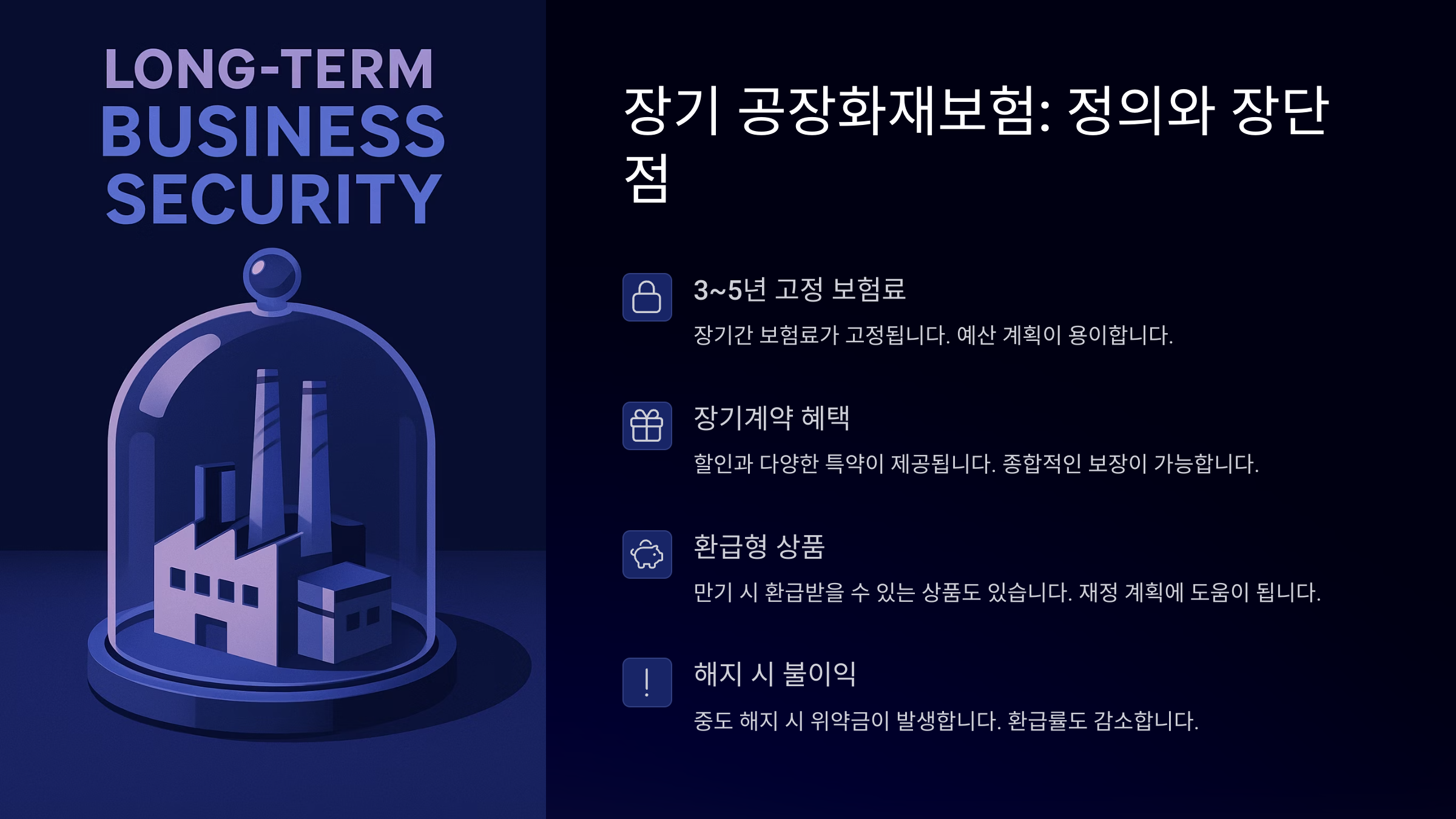 | 구분 | 단기 공장화재보험 (1년 단위) | 장기 공장화재보험 (3년 이상) |
