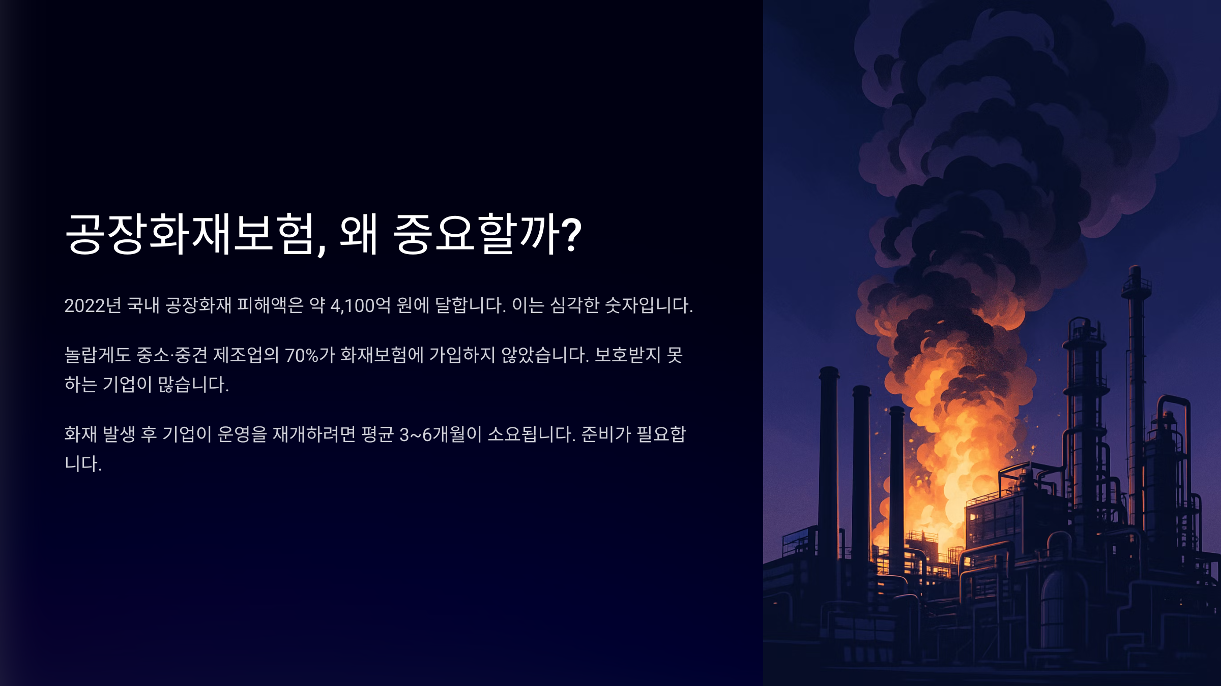 🏭 공장은 수많은 설비와 자재, 그리고 소중한 인력이 모여있는 중요한 생산 기지입니다. 하지만 예기치 못한 화재 사고는 순식간에 막대한 재산 손실과 인명 피해를 야기할 수 있죠. 그래서 공장화재보험은 선택이 아닌 필수입니다.