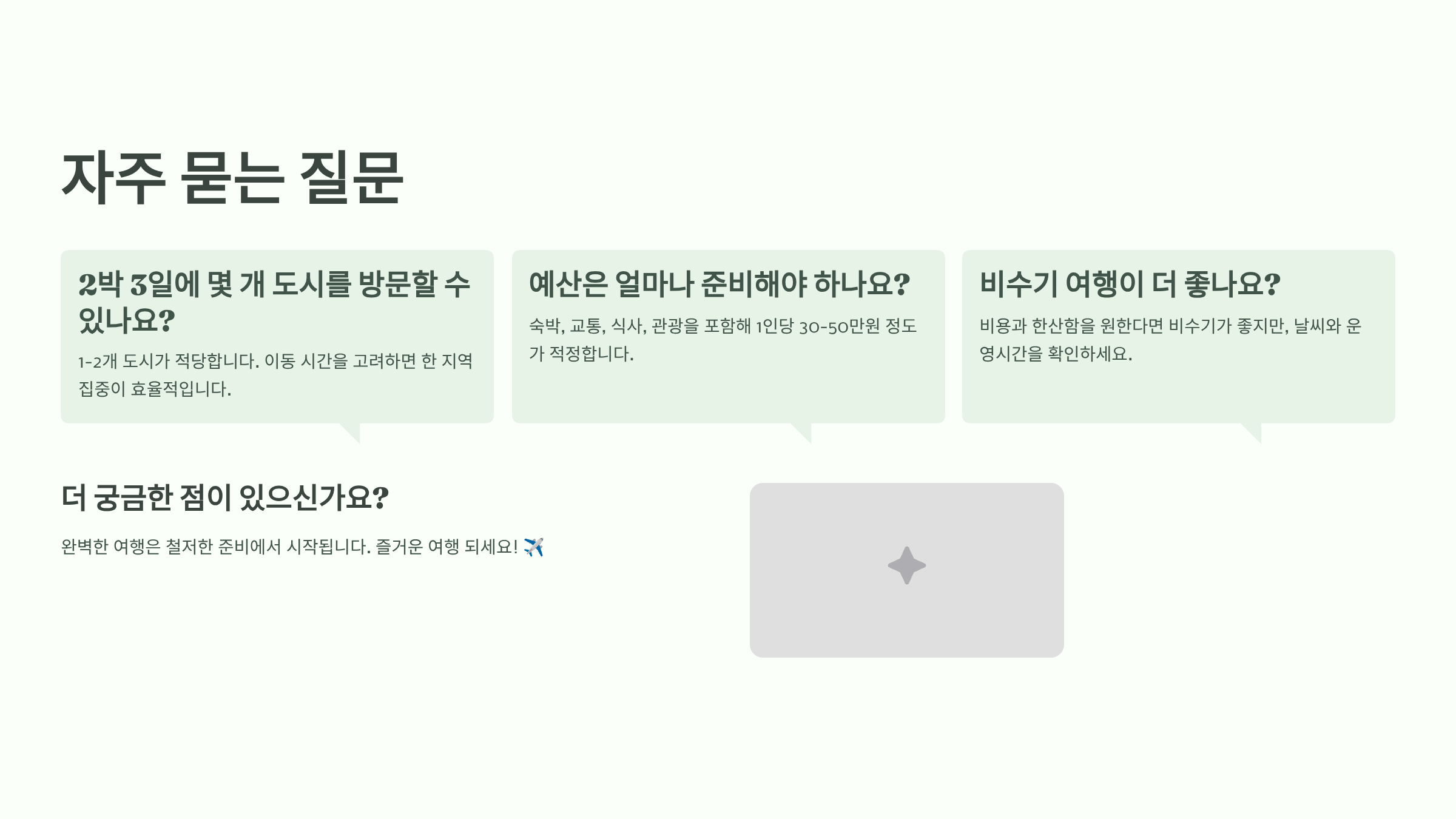 - 오후: 숙소에서 짐을 찾고, 공항/기차역으로 이동하며 짧은 여행의 여운을 남긴 채 마무리합니다.