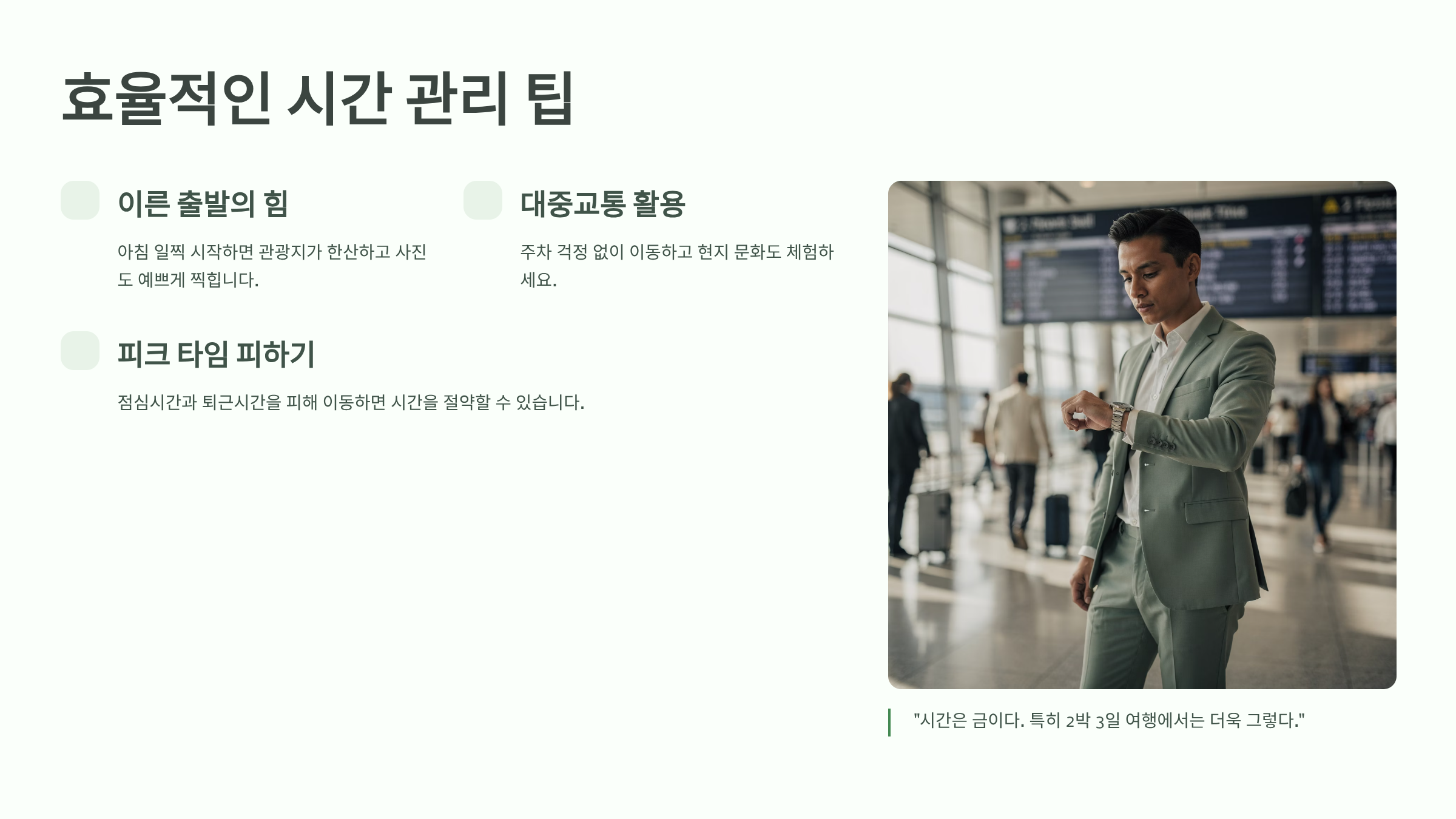 짧은 2박 3일 여행에서는 시간 관리가 곧 여행의 질입니다. 시간을 효율적으로 사용하기 위한 몇 가지 팁을 기억하세요.