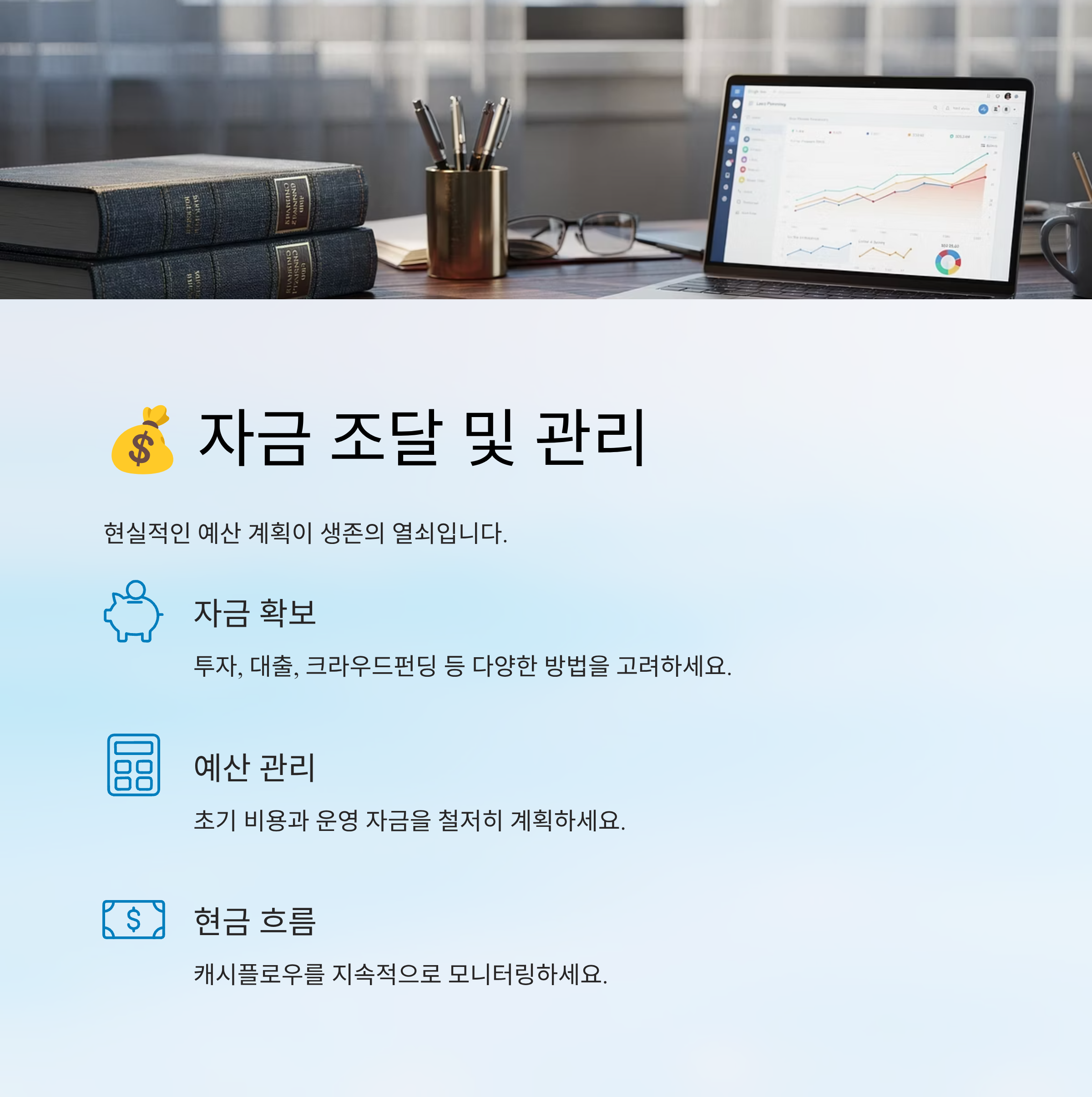 아이디어와 계획이 아무리 훌륭해도, 실행에 필요한 자금이 없다면 무용지물입니다. 창업 초기 자금을 어떻게 조달하고, 어떻게 효율적으로 관리할 것인지에 대한 현실적인 계획이 필요합니다.