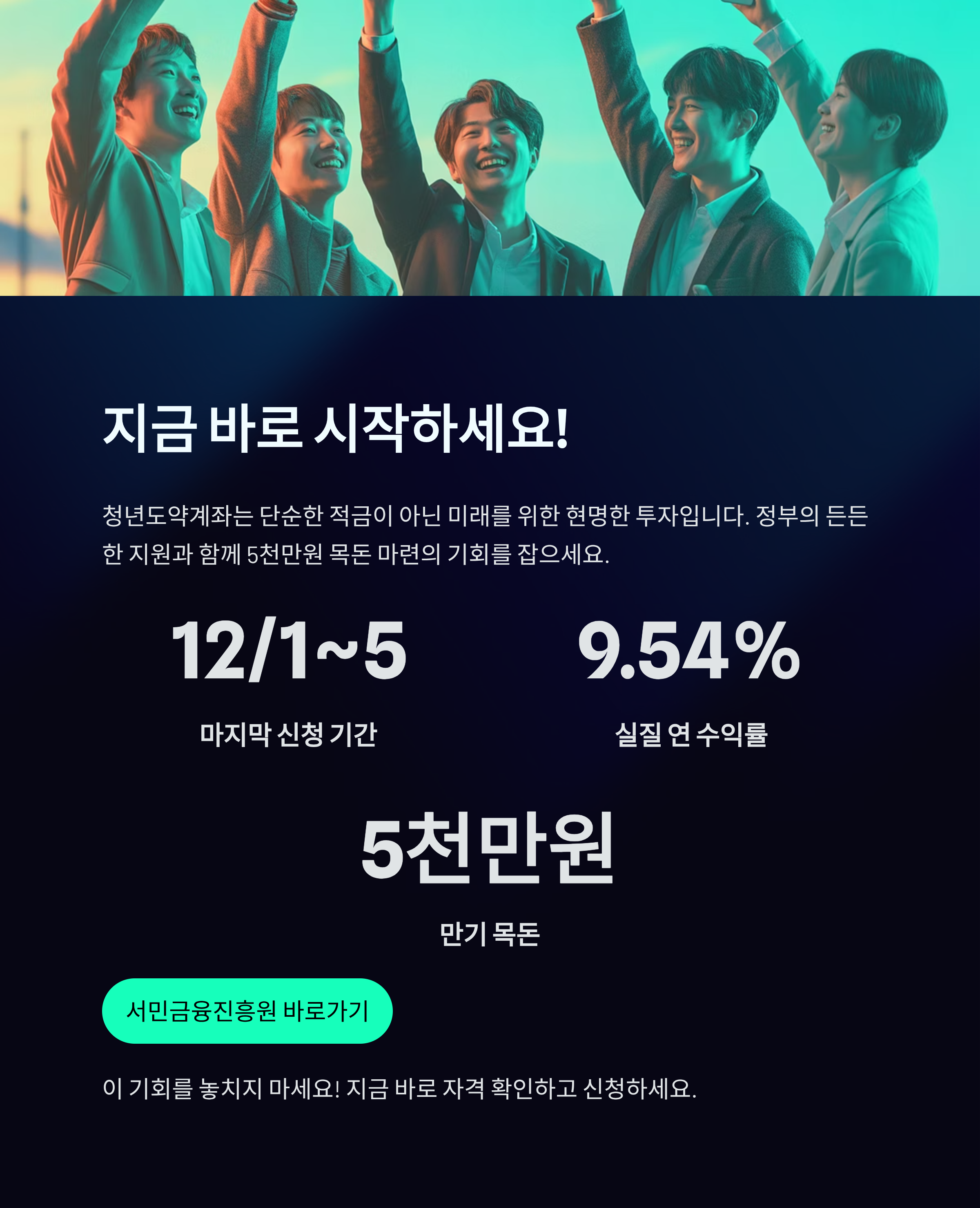 '실질 연 9.54%'라는 파격적인 혜택을 제공하는 청년도약계좌. 이제 그 마지막 가입 기회가 눈앞에 다가왔습니다. 5년이라는 긴 만기 기간이 부담될 수도 있지만, 정부의 든든한 지원을 받으며 강제 저축 습관을 들이고, 5천만원이라는 의미 있는 목돈을 만들 수 있다는 점은 그 어떤 금융 상품과도 비교할 수 없는 큰 장점입니다.
