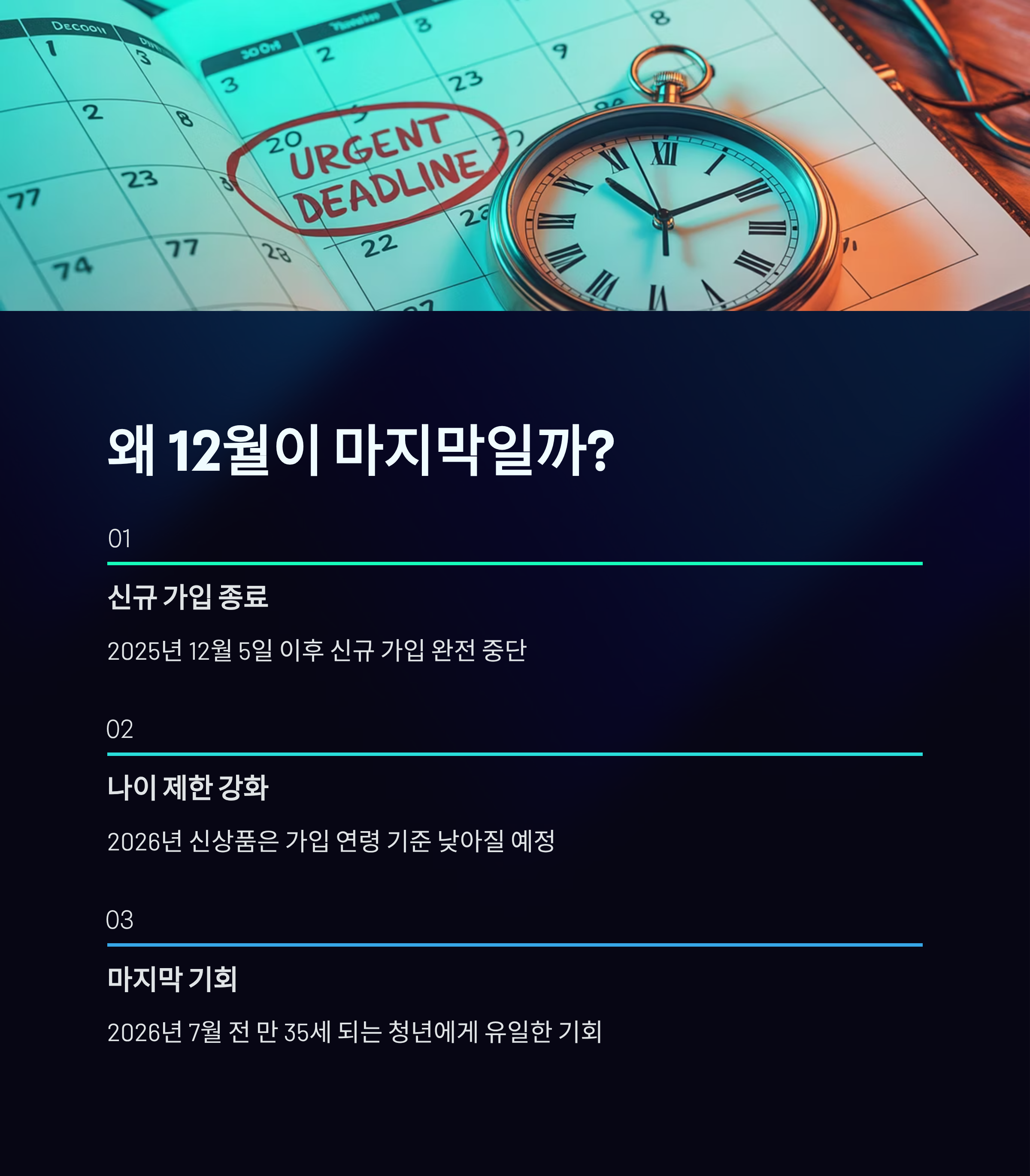 특히, 내년에 만 35세가 되어 더 이상 기회가 없는 청년들에게는 이번 12월이 사회초년기 자산 형성의 중요한 발판을 마련할 수 있는 절호의 기회입니다. 자신의 자격 요건을 꼼꼼히 확인하고, 장기적인 자금 계획을 세워 마지막 신청 기간을 놓치지 마시길 바랍니다.