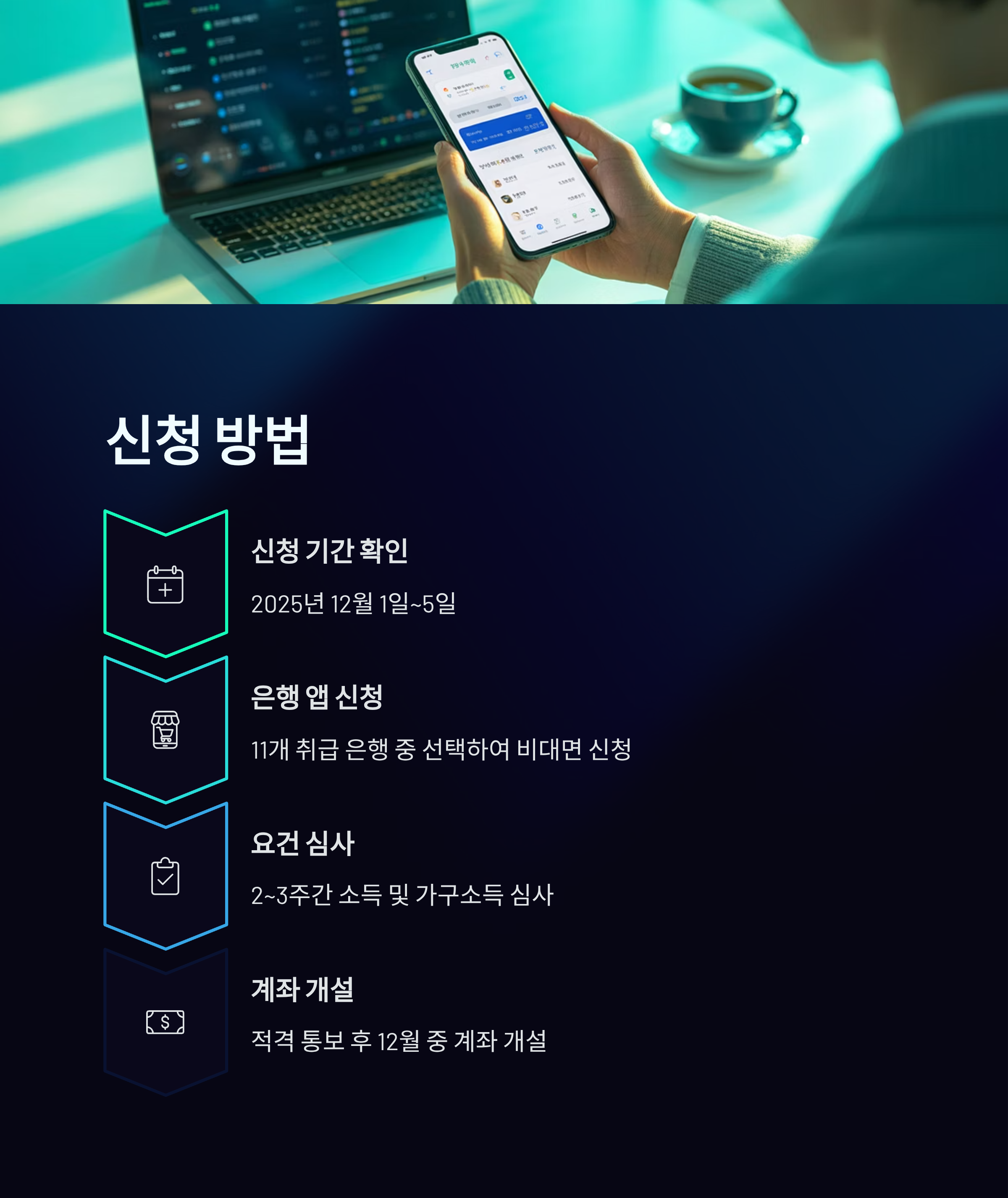 - 12월 계좌 개설 기간 (예시): 1인 가구는 12월 11일~29일, 2인 이상 가구는 12월 22일~29일과 같이 가구 유형에 따라 기간이 다를 수 있습니다. (공고 확인 필수)