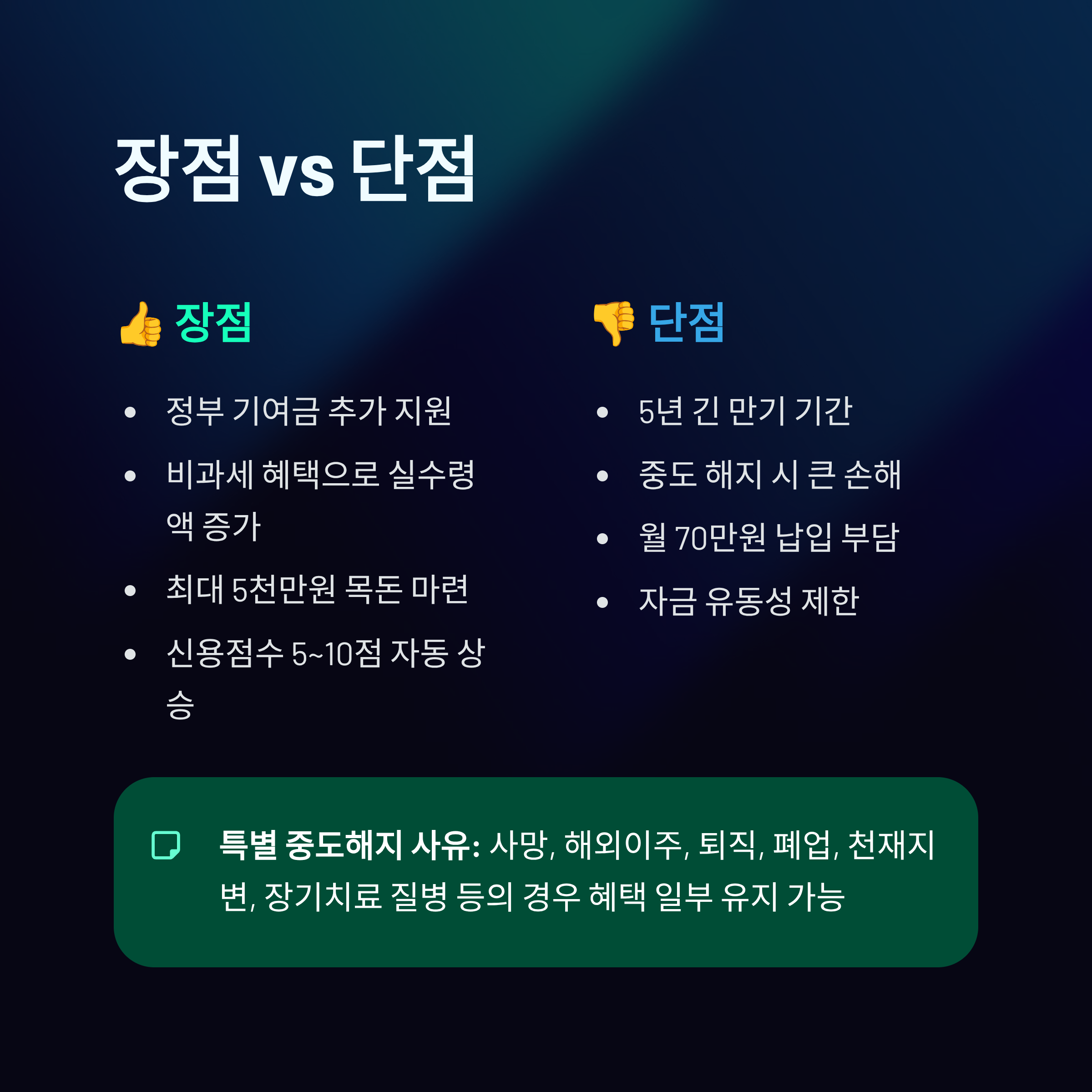 특별 중도 해지 사유: 가입자의 사망/해외 이주, 퇴직, 사업장 폐업, 천재지변, 장기 치료가 필요한 질병 등 예외적인 경우에는 정부 기여금과 비과세 혜택 일부가 유지될 수 있습니다.