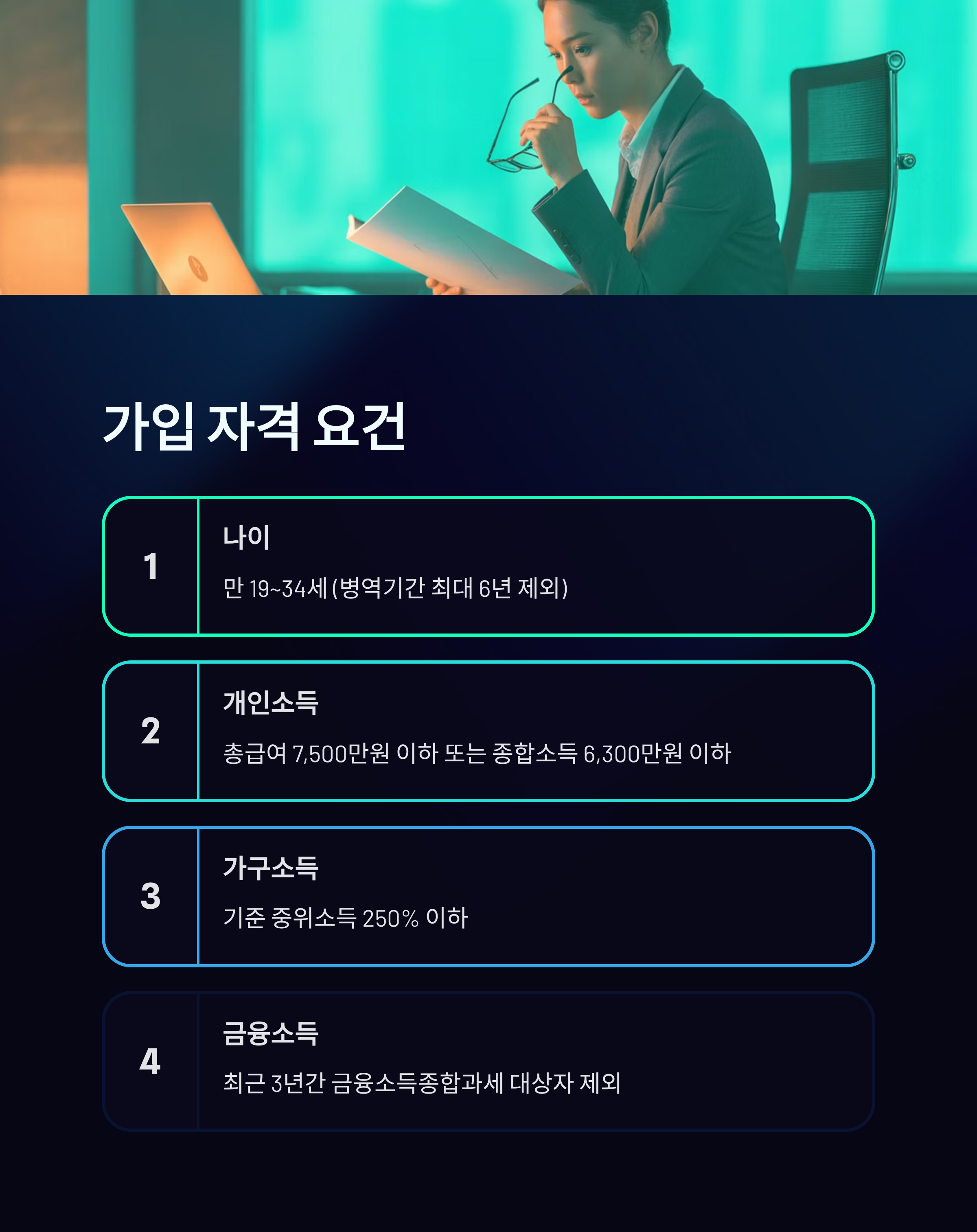 - 가입 대상: 만 19~34세 청년 (소득 및 가구소득 요건 충족 시)