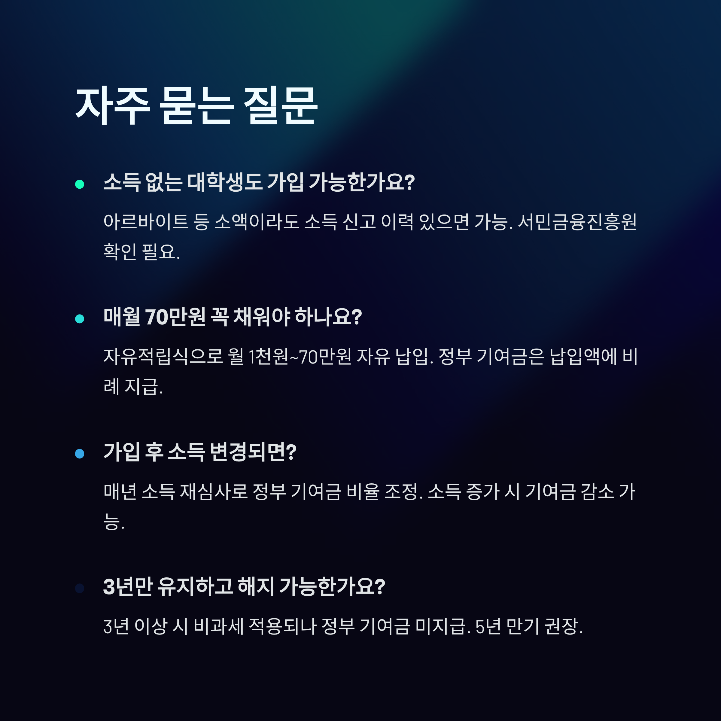 - 납입 부담: 월 최대 70만원이라는 금액은 청년들에게 부담으로 작용할 수 있습니다. (단, 자유적립식이므로 매월 납입액 조절은 가능)