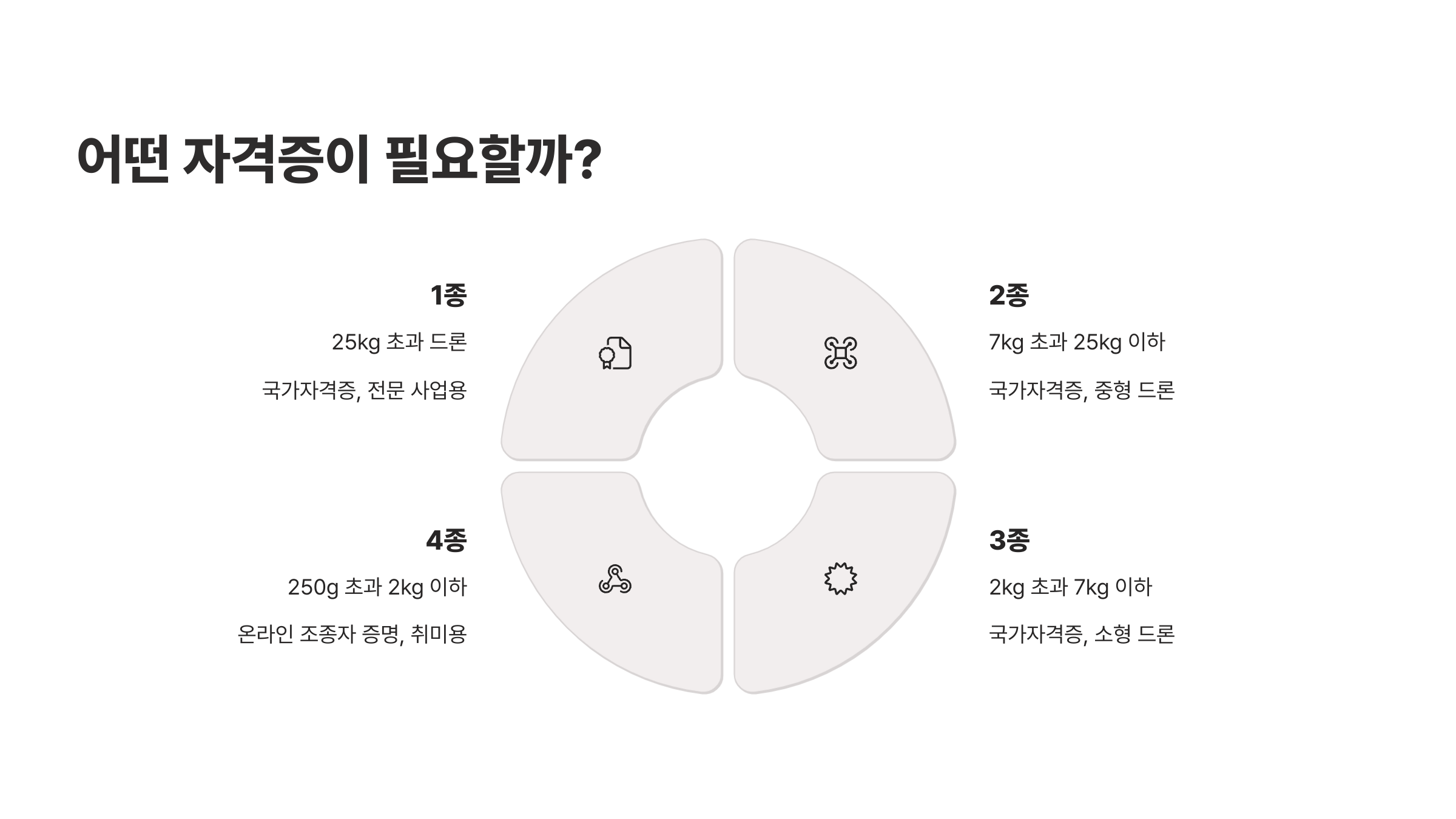 드론 자격증은 조종하려는 드론의 최대 이륙 중량에 따라 크게 4가지 종류로 나뉩니다. 내가 어떤 드론을, 어떤 목적으로 사용하려는지에 따라 필요한 자격증 종류가 달라지므로 정확히 이해하는 것이 중요합니다.