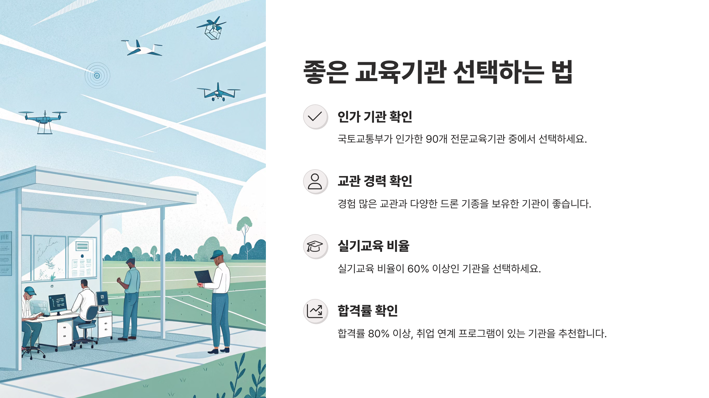 - ✅ 국토교통부 지정 여부 확인 (필수): 가장 먼저, 해당 교육기관이 국토교통부로부터 정식으로 지정받은 전문 교육기관인지 반드시 확인해야 합니다. '드론 원스톱 민원서비스' 포털 등에서 지정 교육기관 목록을 확인할 수 있습니다.