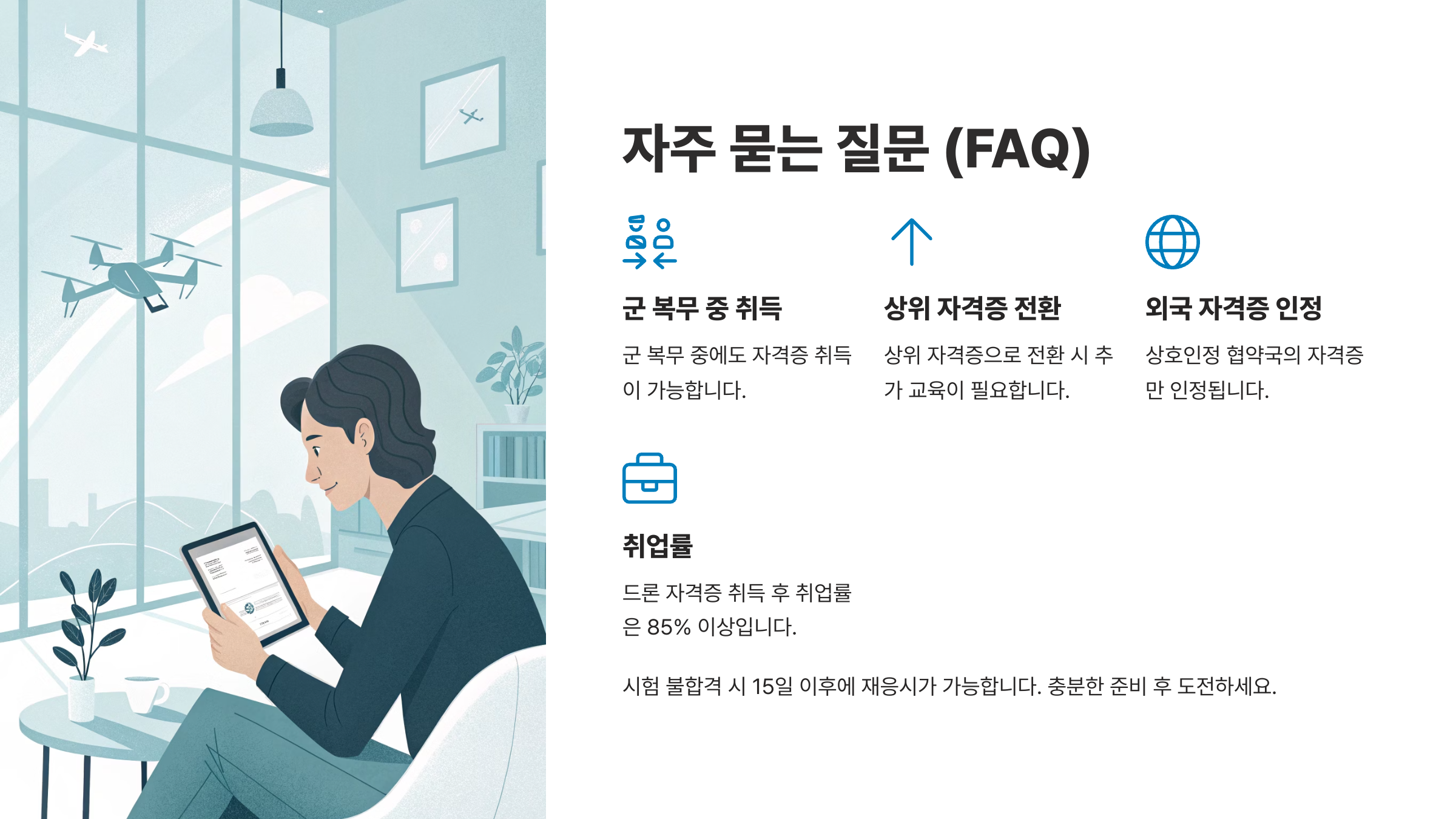 A4. 드론 자격증은 드론 조종 능력을 증명하는 기본적인 자격이지만, 자격증 취득 자체가 바로 취업으로 이어지는 것은 아닙니다. 관련 분야(촬영, 측량, 방제 등)의 전문 지식과 실무 경험, 포트폴리오 등을 함께 갖추는 것이 취업 경쟁력을 높이는 데 중요합니다.