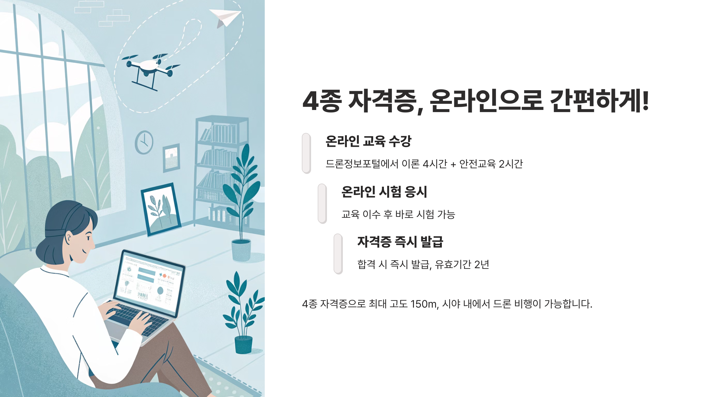 4종 자격증은 취미로 드론을 시작하는 분들에게 필수적인 과정이며, 안전한 드론 비행을 위한 기본적인 지식을 습득하는 데 목적이 있습니다. 온라인으로 언제 어디서든 편리하게 이수할 수 있다는 장점이 있습니다.