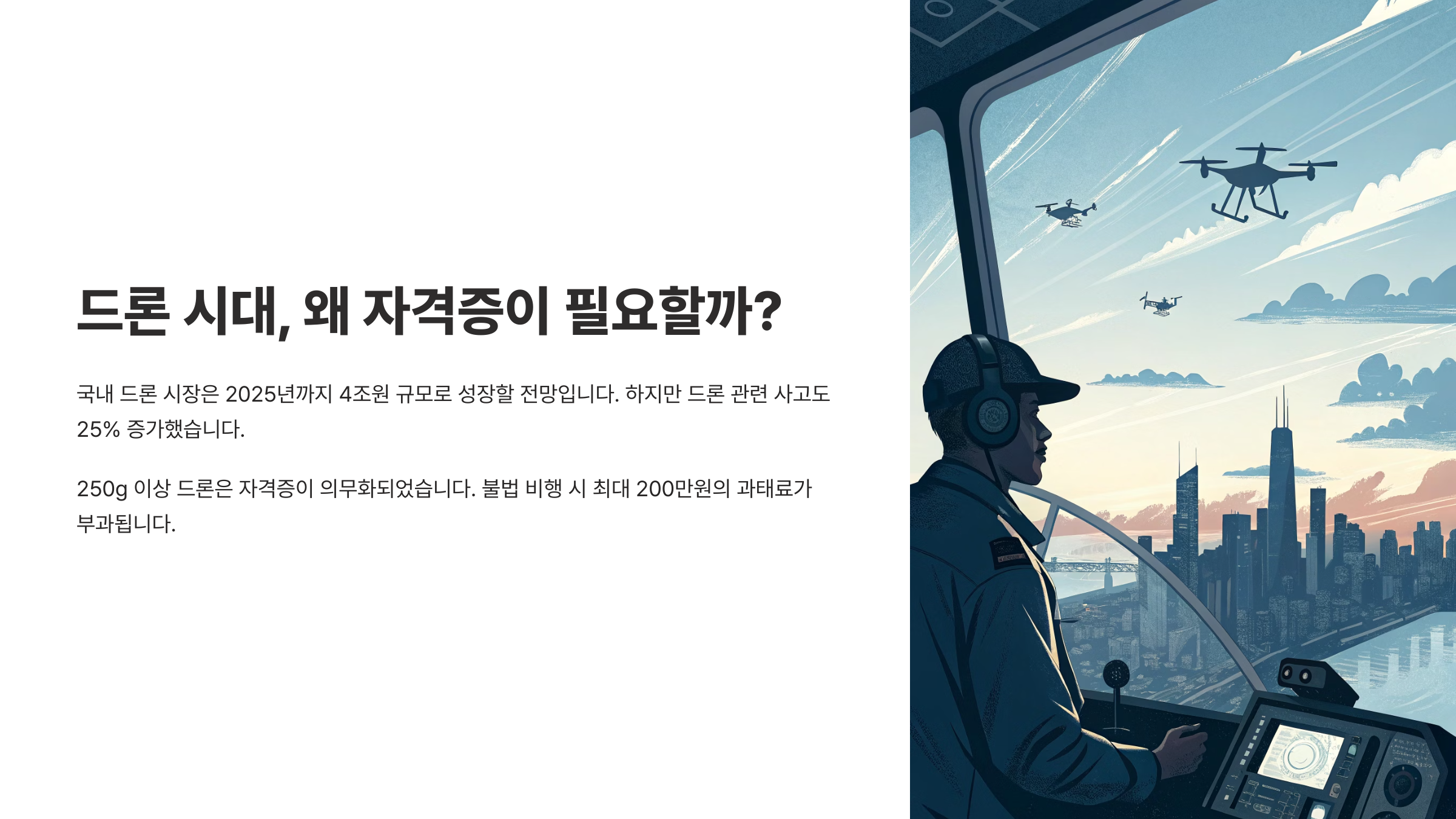 ※ 250g 이하의 완구용 드론은 별도의 자격증 없이 비행 가능합니다. (단, 비행 금지 구역 등 규정 준수 필요)