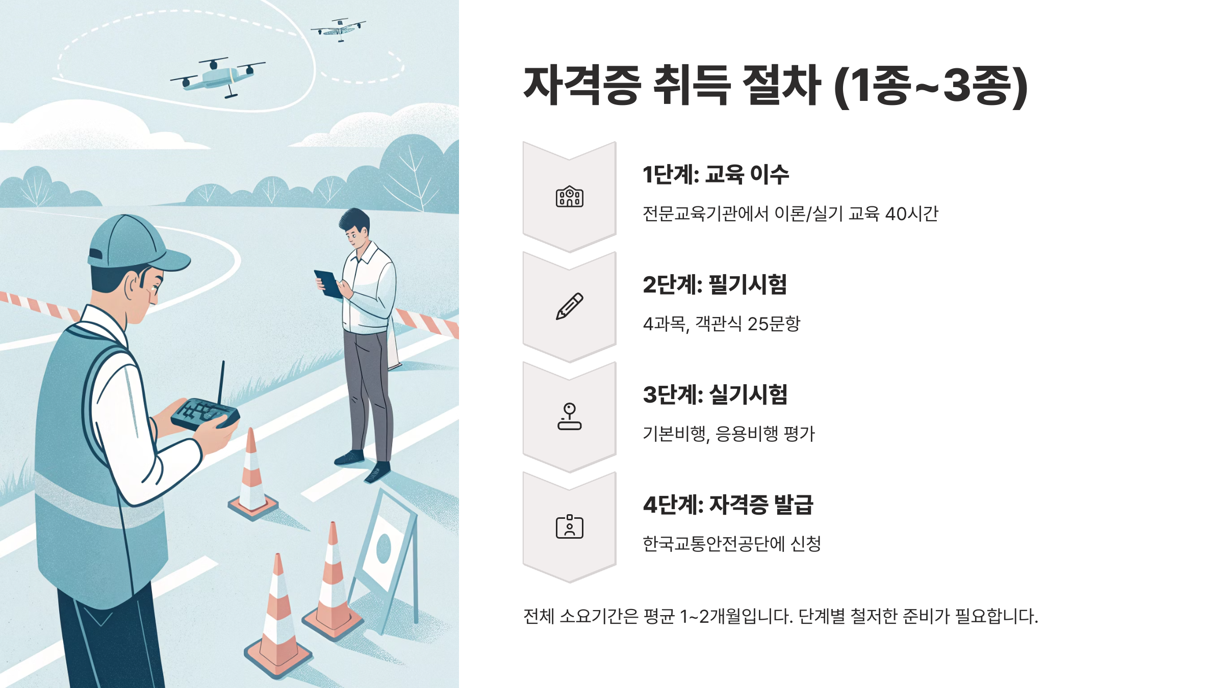 시험과 실기 교육이 필요한 1종, 2종, 3종 드론 자격증 취득 절차는 크게 다음과 같은 단계를 거칩니다. 4종은 별도 섹션에서 설명합니다.