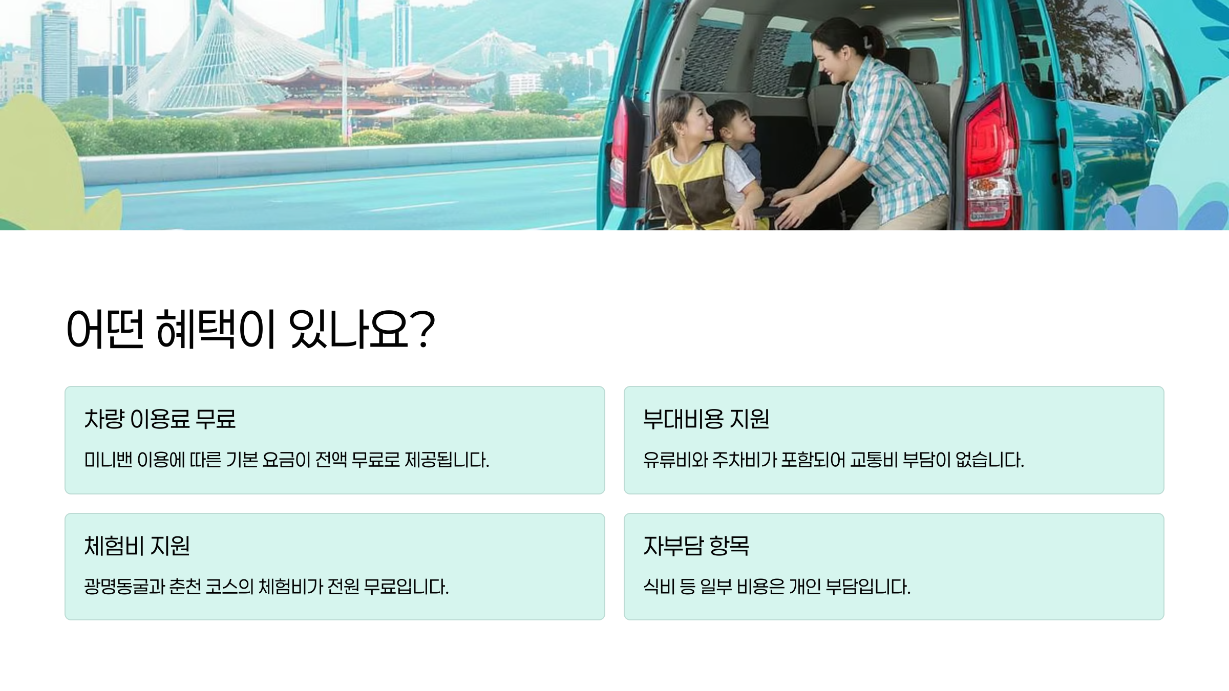 - 차량 이용: 예약된 시간에 지정된 장소에서 다누림 미니밴 탑승