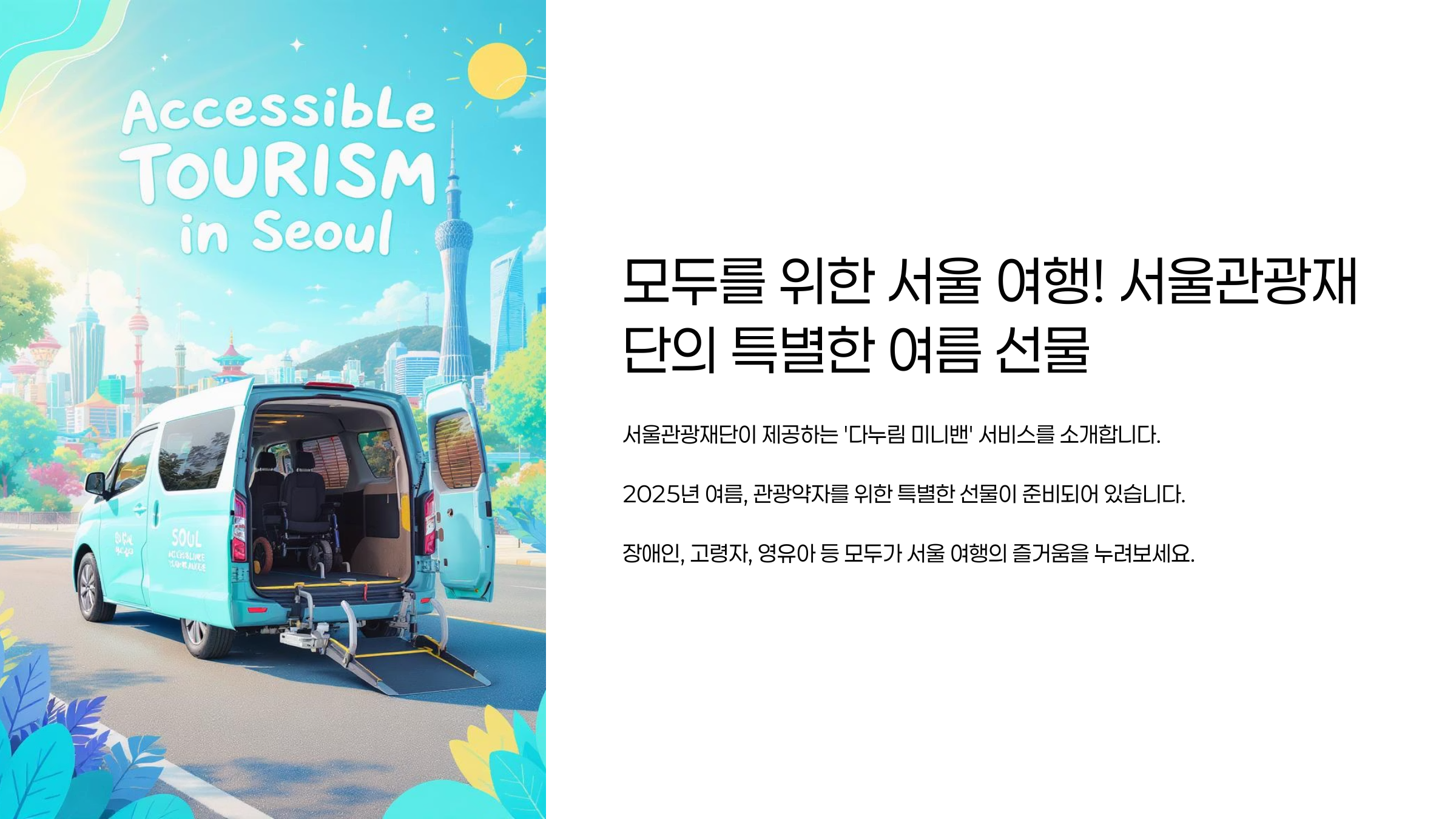 따뜻한 햇살과 함께 설레는 여름휴가 시즌이 다가오고 있습니다! ☀️ 하지만 거동이 불편하신 분들이나 휠체어를 이용하시는 분들에게 서울 여행은 때때로 많은 고민과 어려움을 동반하기도 하죠. 이러한 분들의 편안하고 즐거운 서울 여행을 위해 서울관광재단에서 아주 특별한 여름 선물을 준비했다는 반가운 소식입니다!