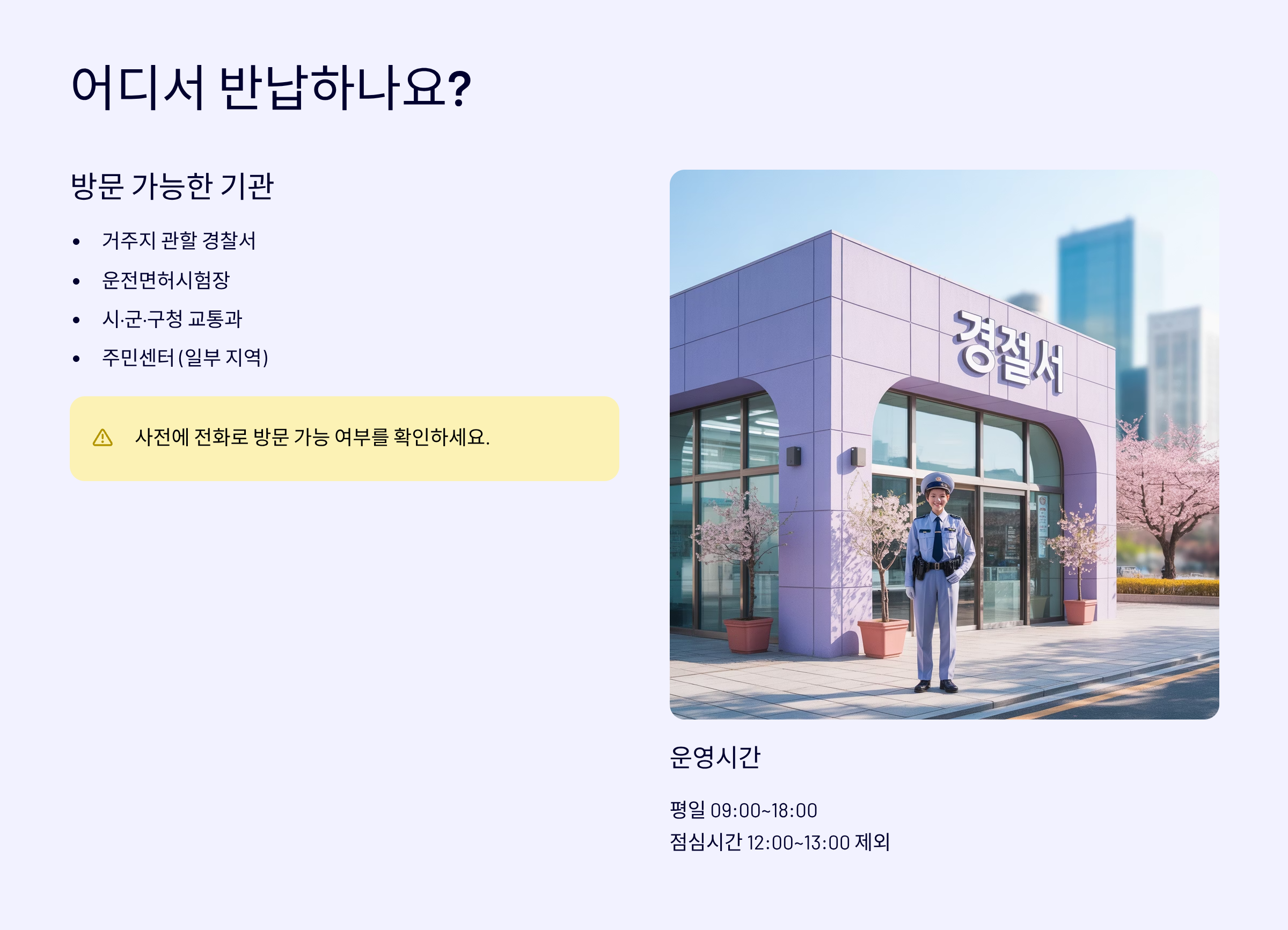 그리고 제일 중요한 건, 반납 이후에는 다시 운전을 하면 무면허 운전이 돼요! 혹시라도 나중에 마음이 바뀌어 다시 운전하고 싶다면, 새로 면허시험을 보고 발급받아야 한답니다.