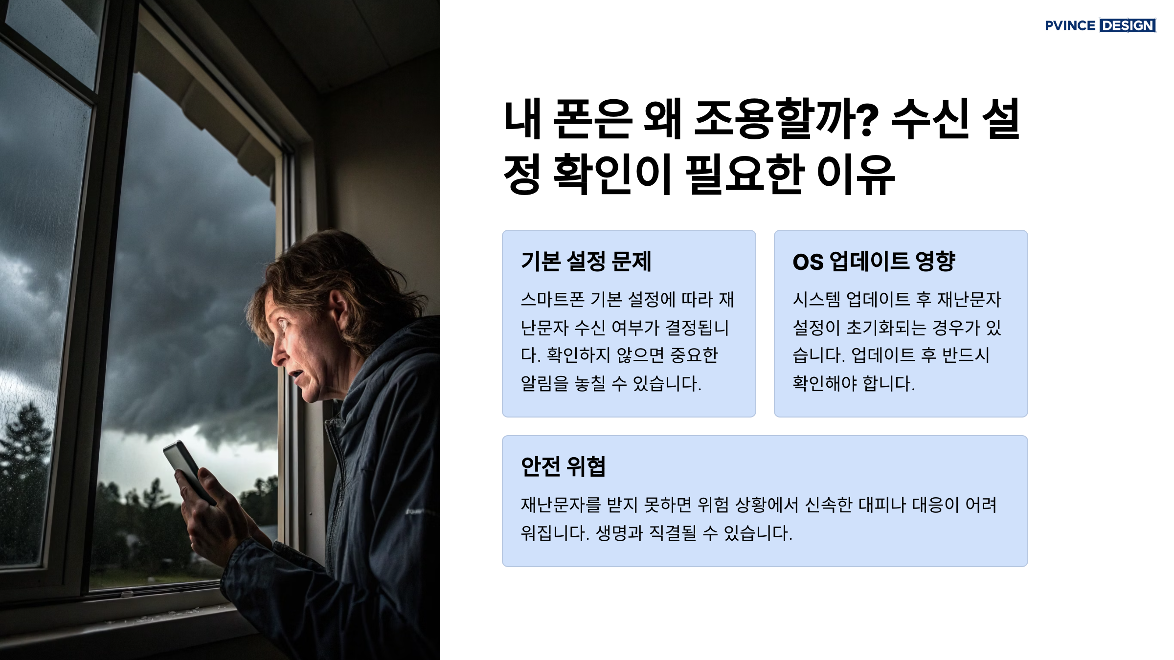 어떤 이유든, 중요한 정보를 놓치지 않으려면 지금 바로 내 휴대폰의 재난 문자 수신 설정을 확인해보는 것이 좋습니다.