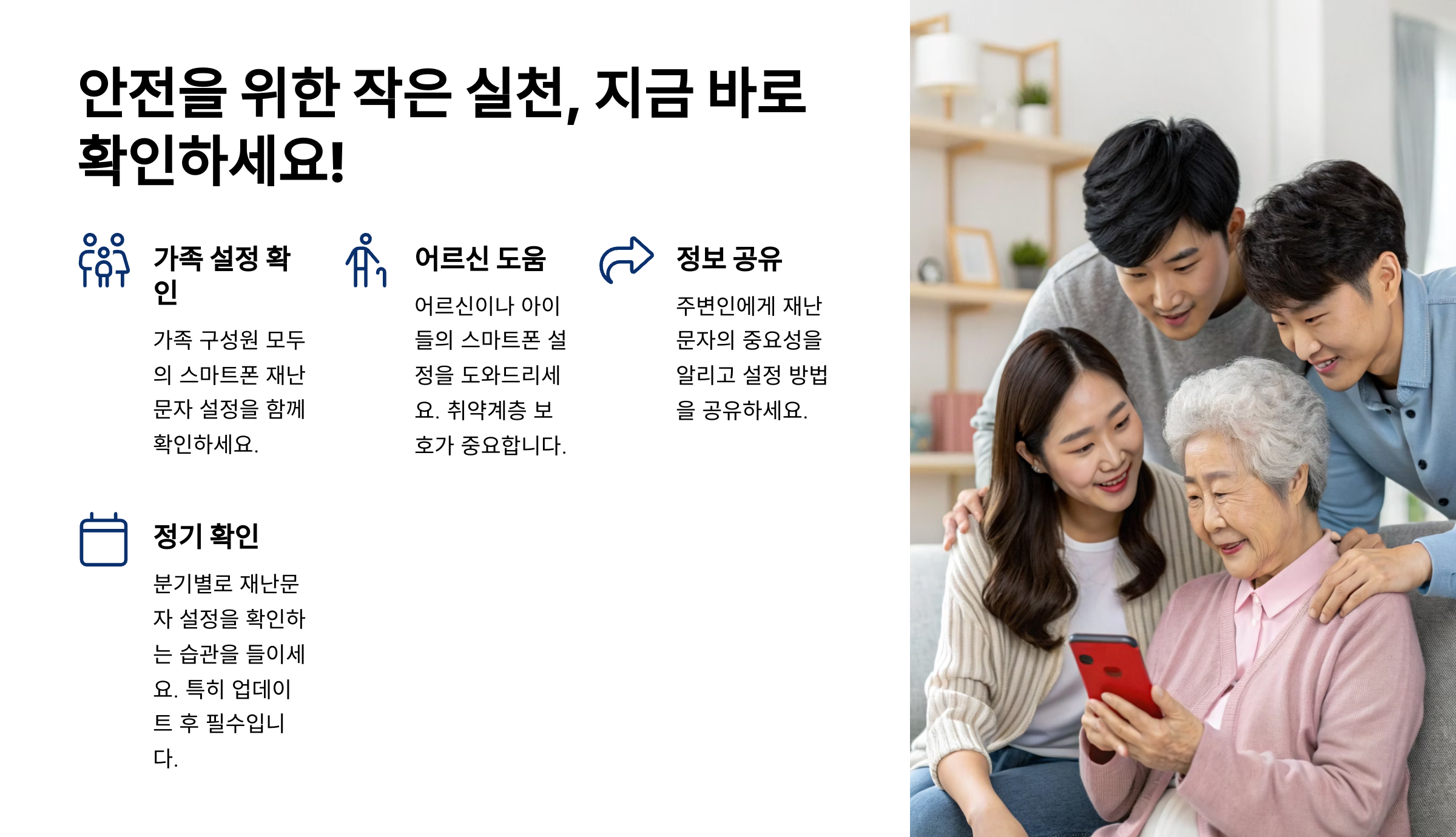 재난은 예고 없이 찾아옵니다. "나는 괜찮겠지"라는 생각보다, 만일의 사태에 대비하는 자세가 중요합니다. 단 몇 분만 투자하여 내 휴대폰의 재난 문자 수신 설정을 확인하고 켜두는 작은 실천이 나와 내 가족의 안전을 지키는 데 큰 도움이 될 수 있습니다.